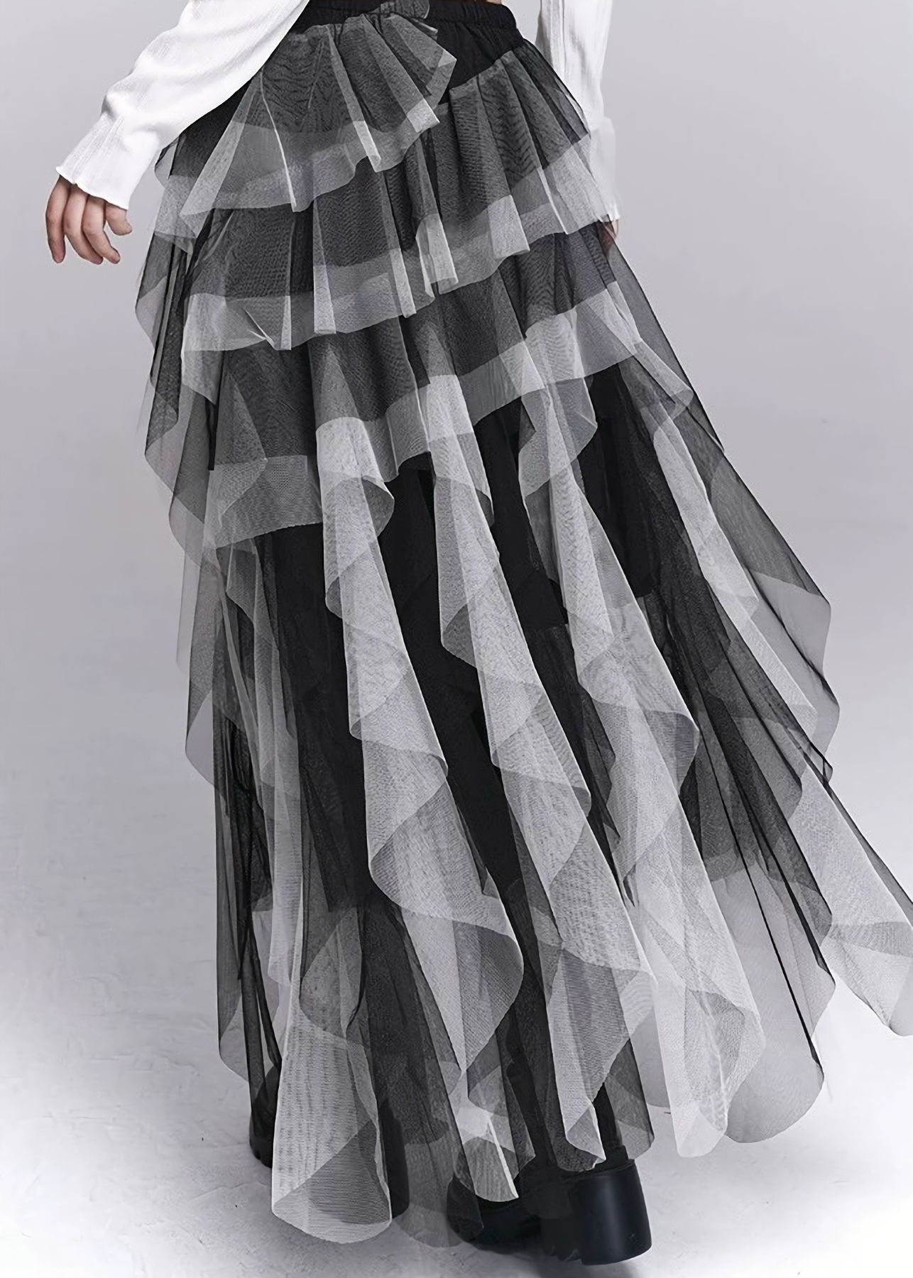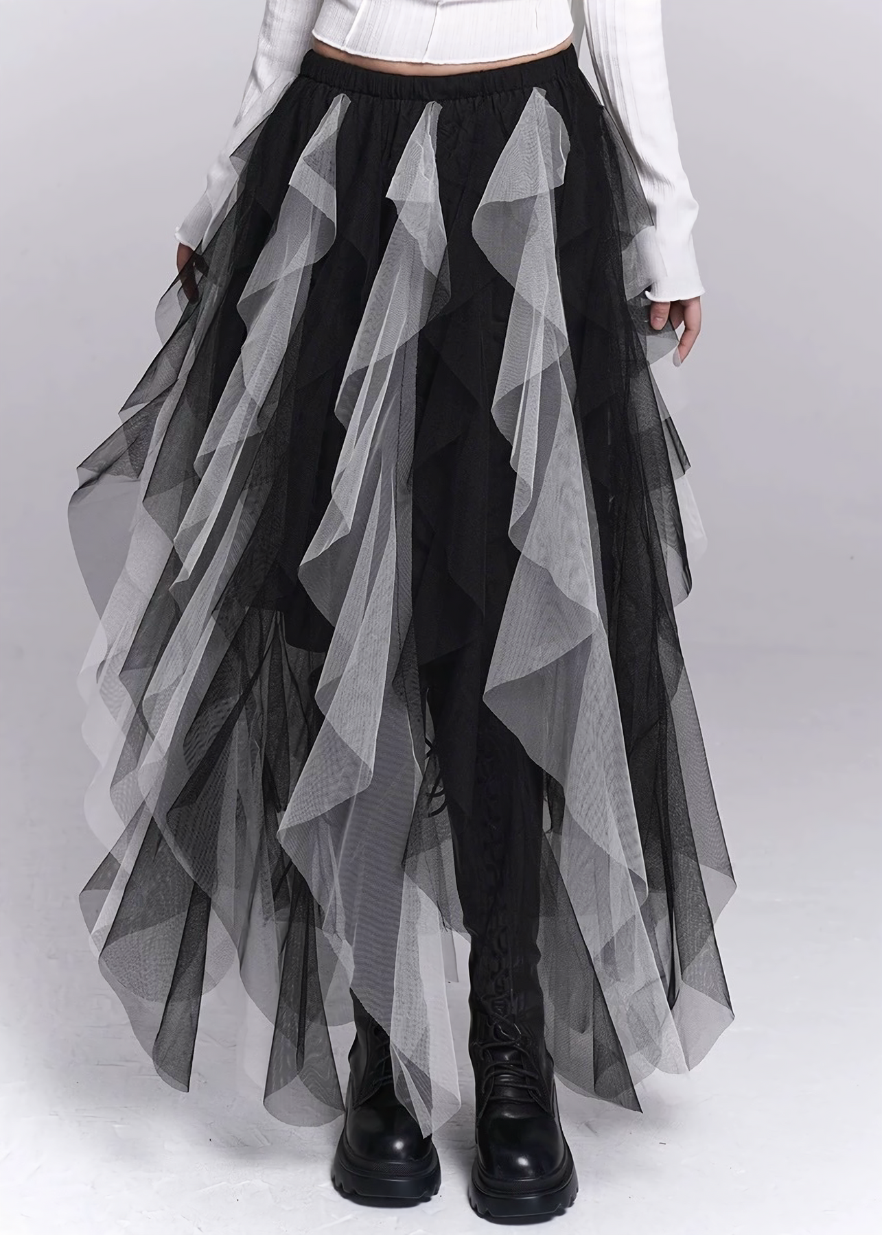 柔らかなドレープがシルエットに動きを作るトップス。レイヤードスカートと合わせて縦ラインを強調します。