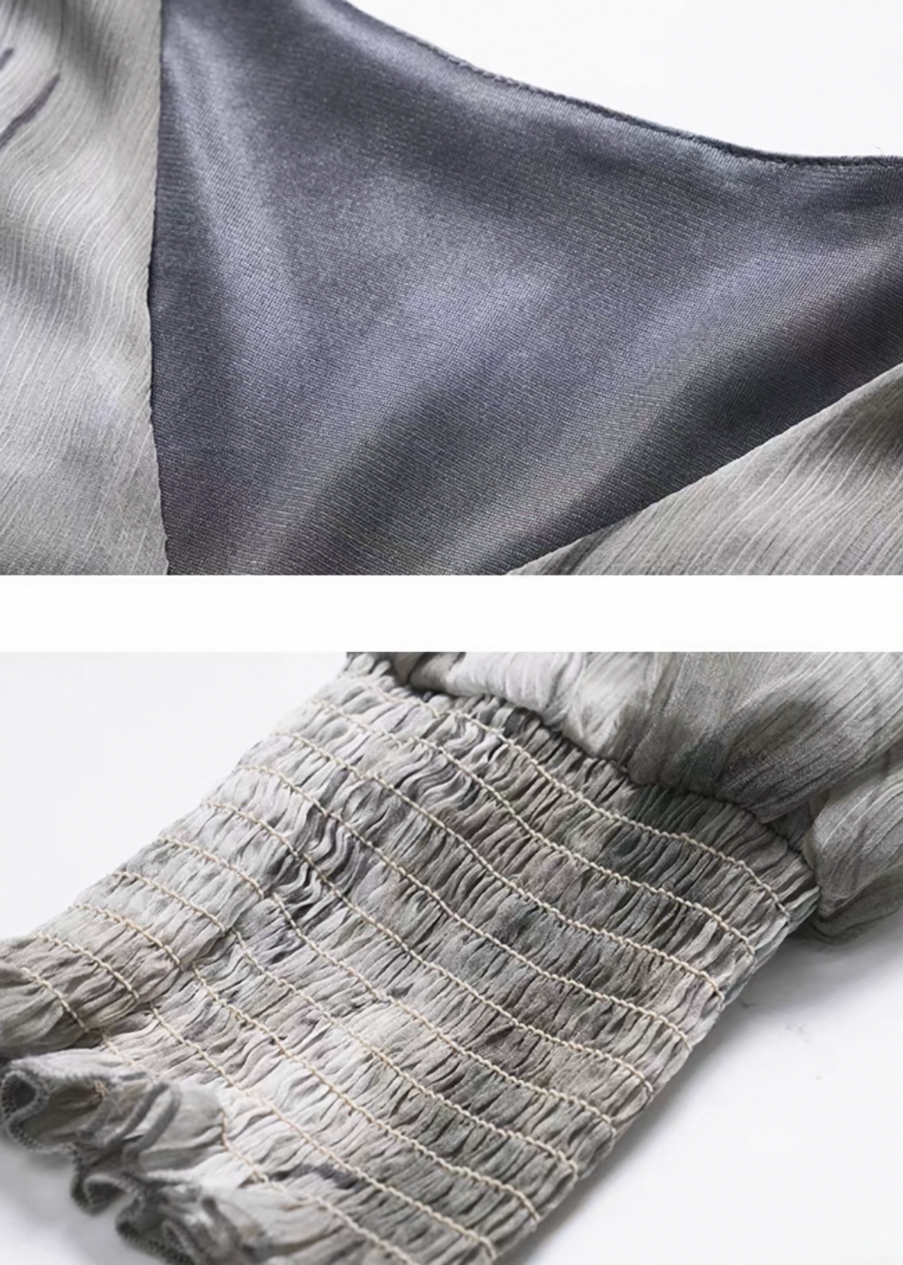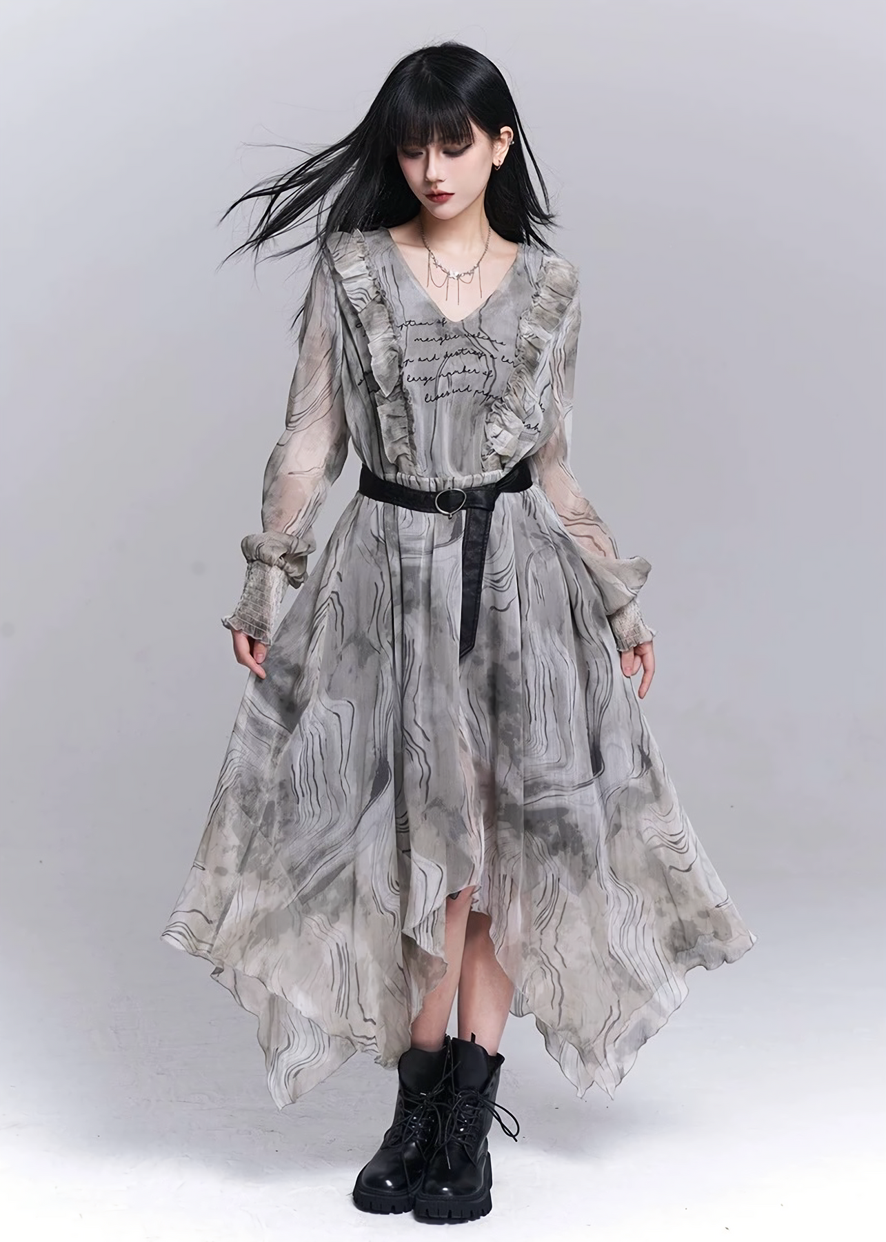 グレーのニュアンス柄を、軽やかなシアー素材に落とし込んだロングワンピース。
