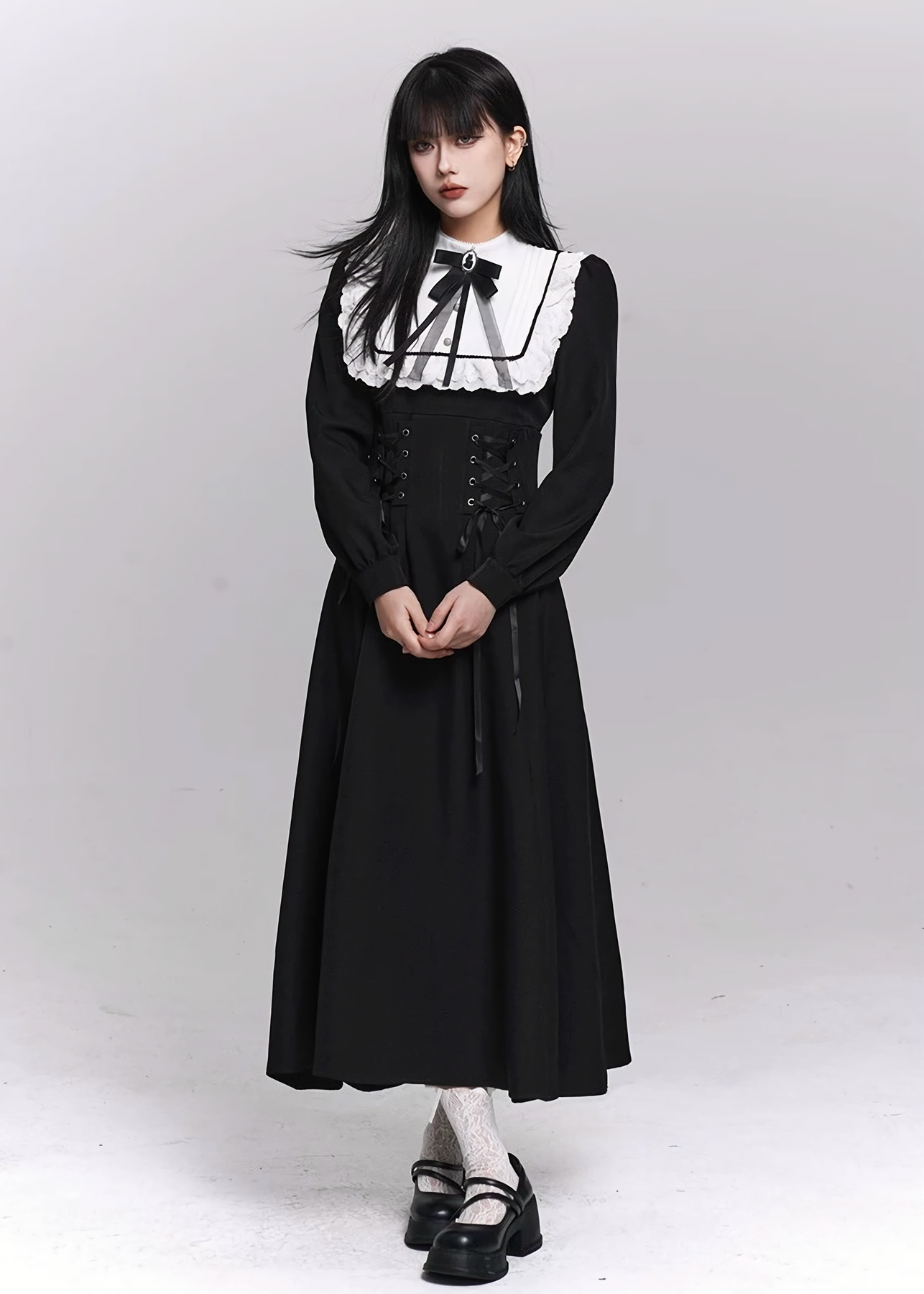 闇に沈むような漆黒のボディに、クラシカルなホワイトカラーを配したゴシックメイドロングドレス
