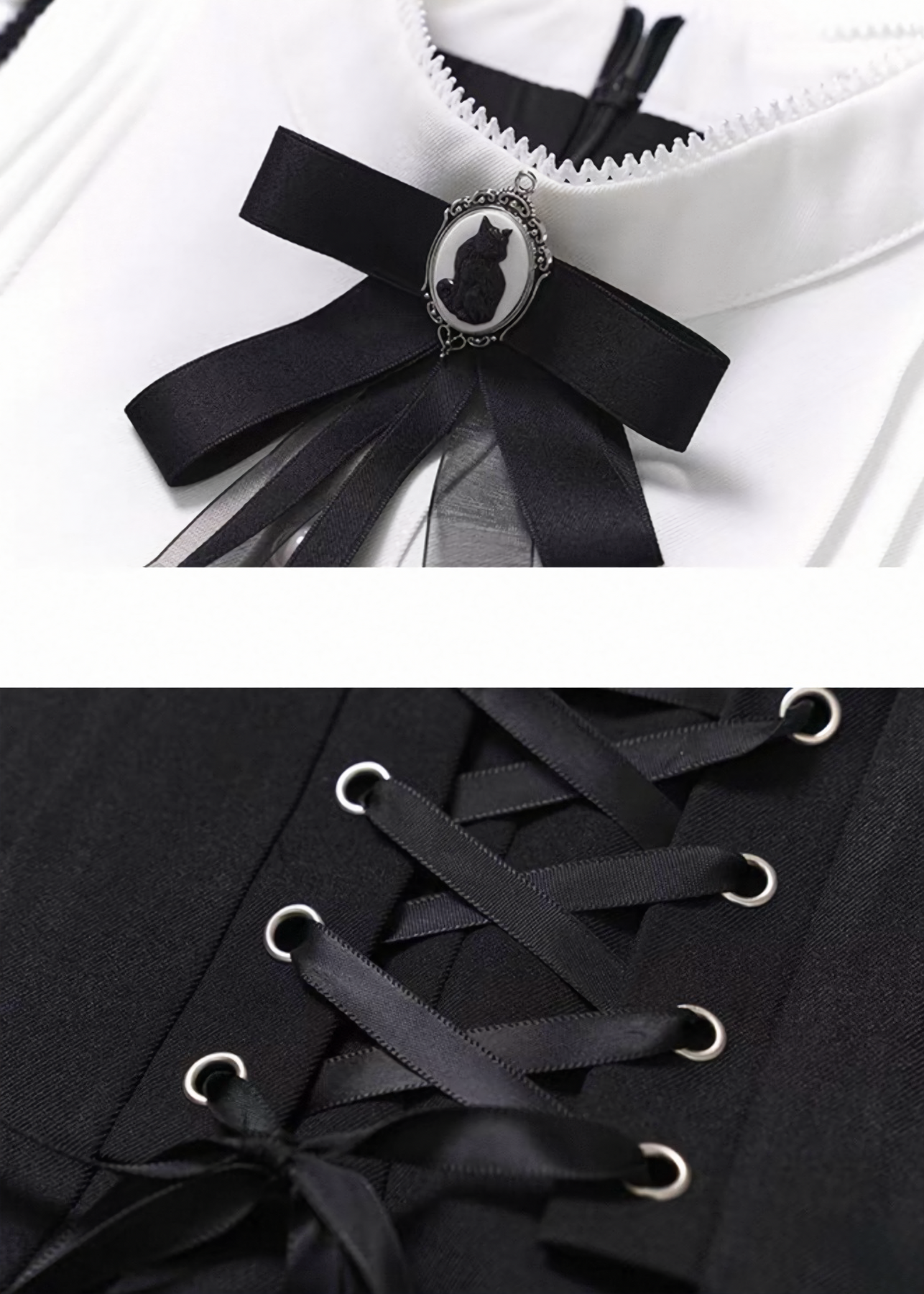 胸元を飾るフリルヨークと、大きなリボンブローチが視線を奪い、静かな可愛さと退廃的な気品を纏わせます。