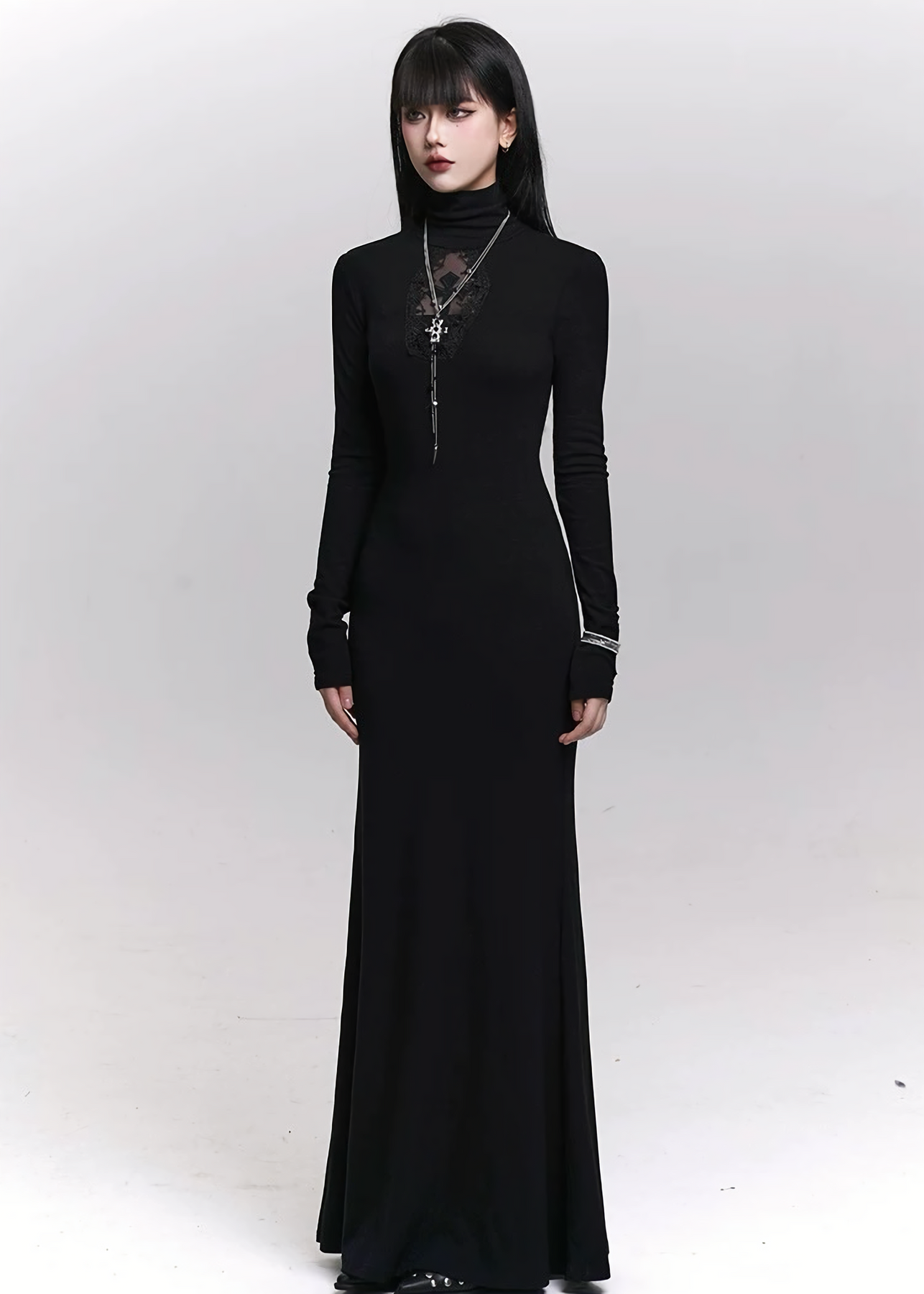 深い闇の中に静かに浮かぶようなタイトシルエットが、身体の輪郭を淡く描き出すロングドレス。
