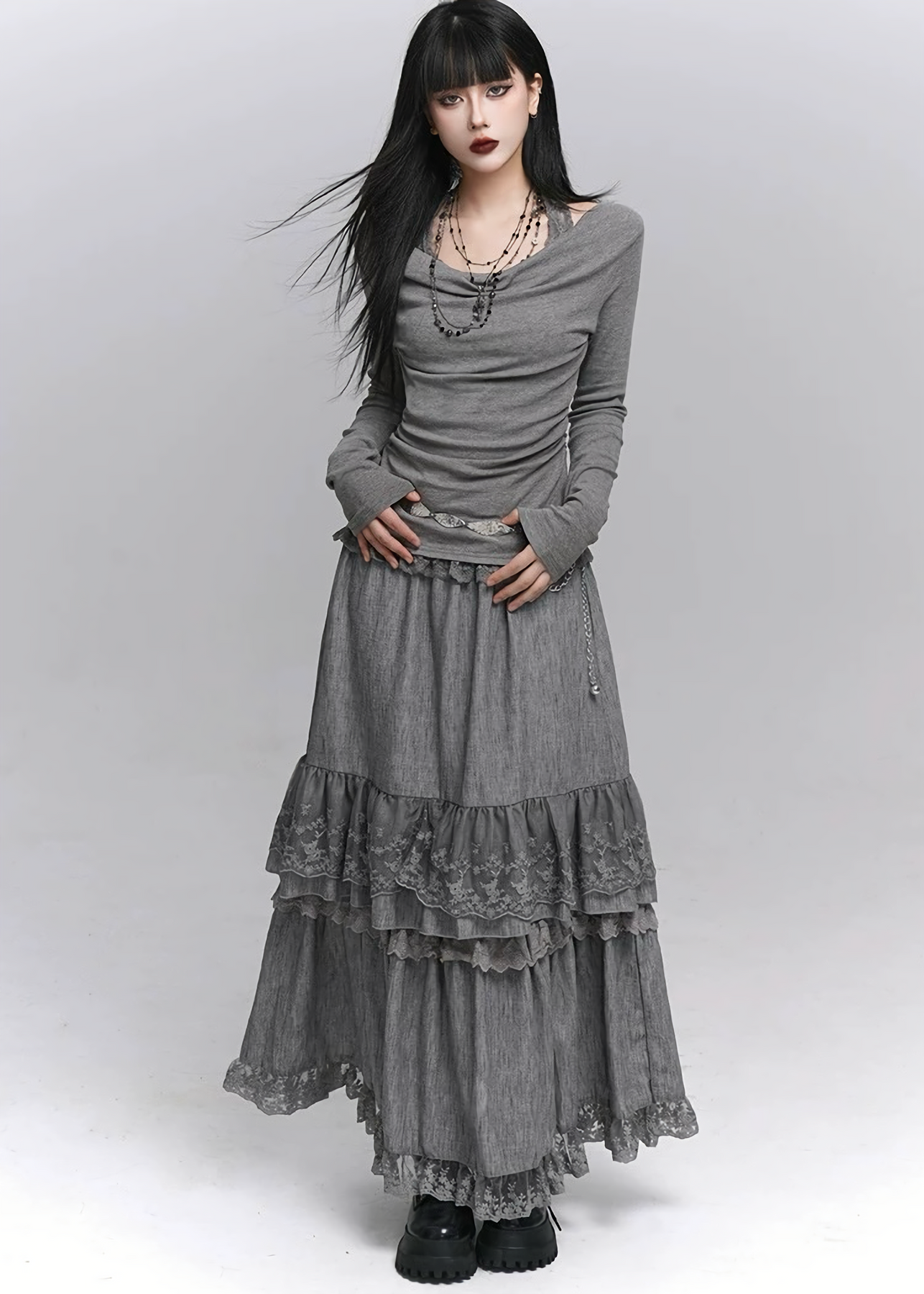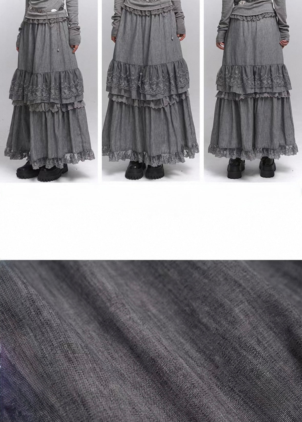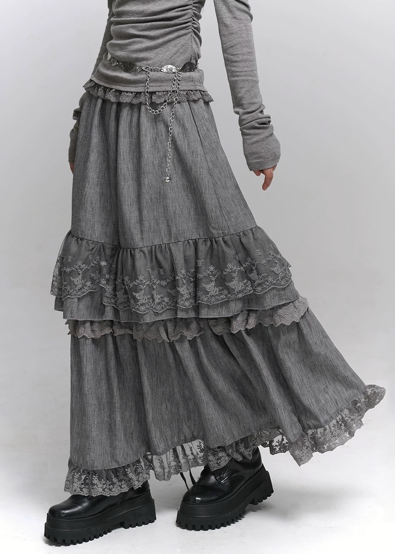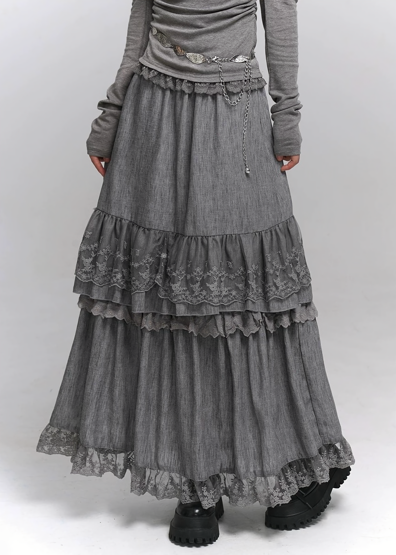 繊細なレースとフリルを重ねた、アンティークドレスのようなロングスカート🩶