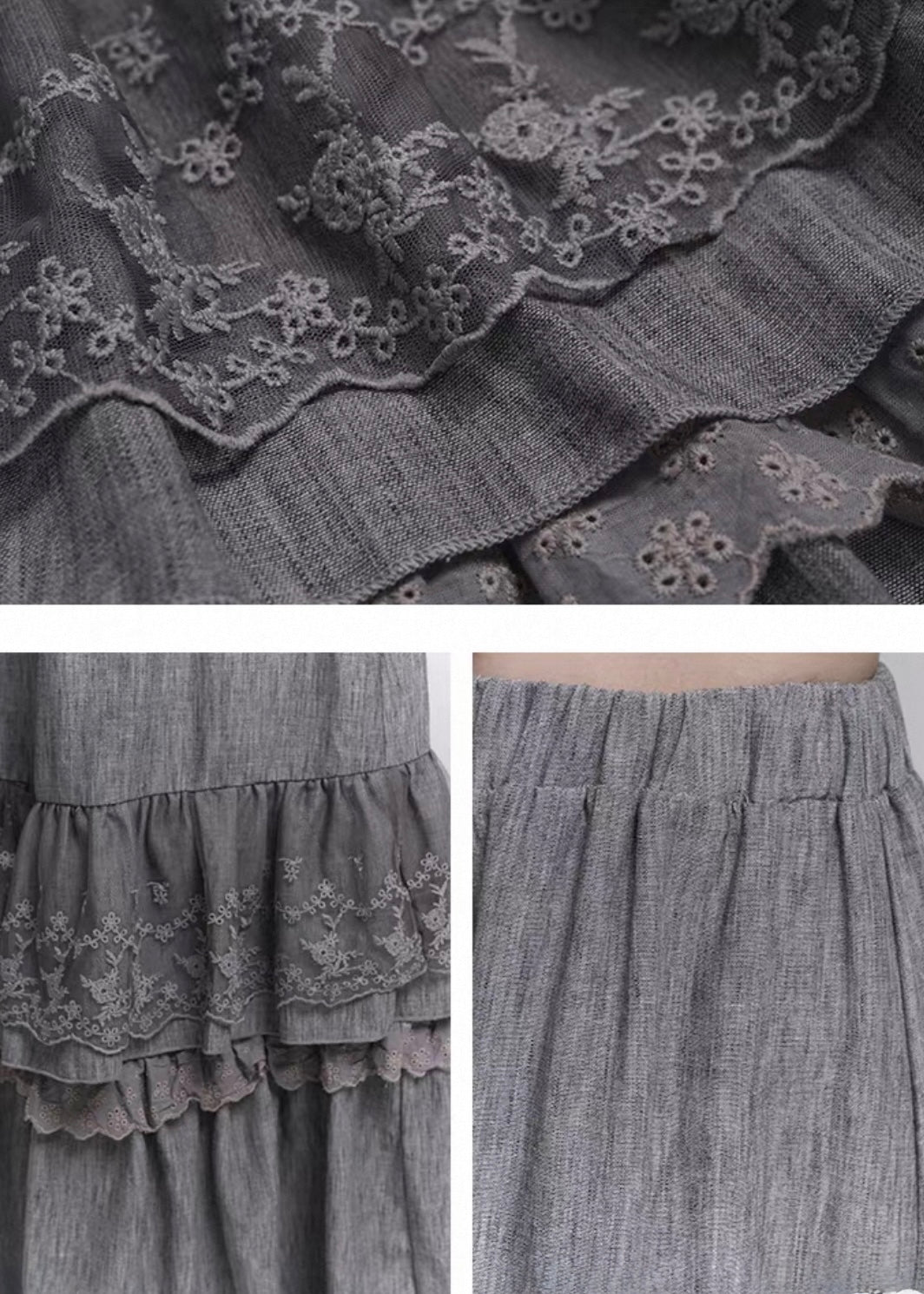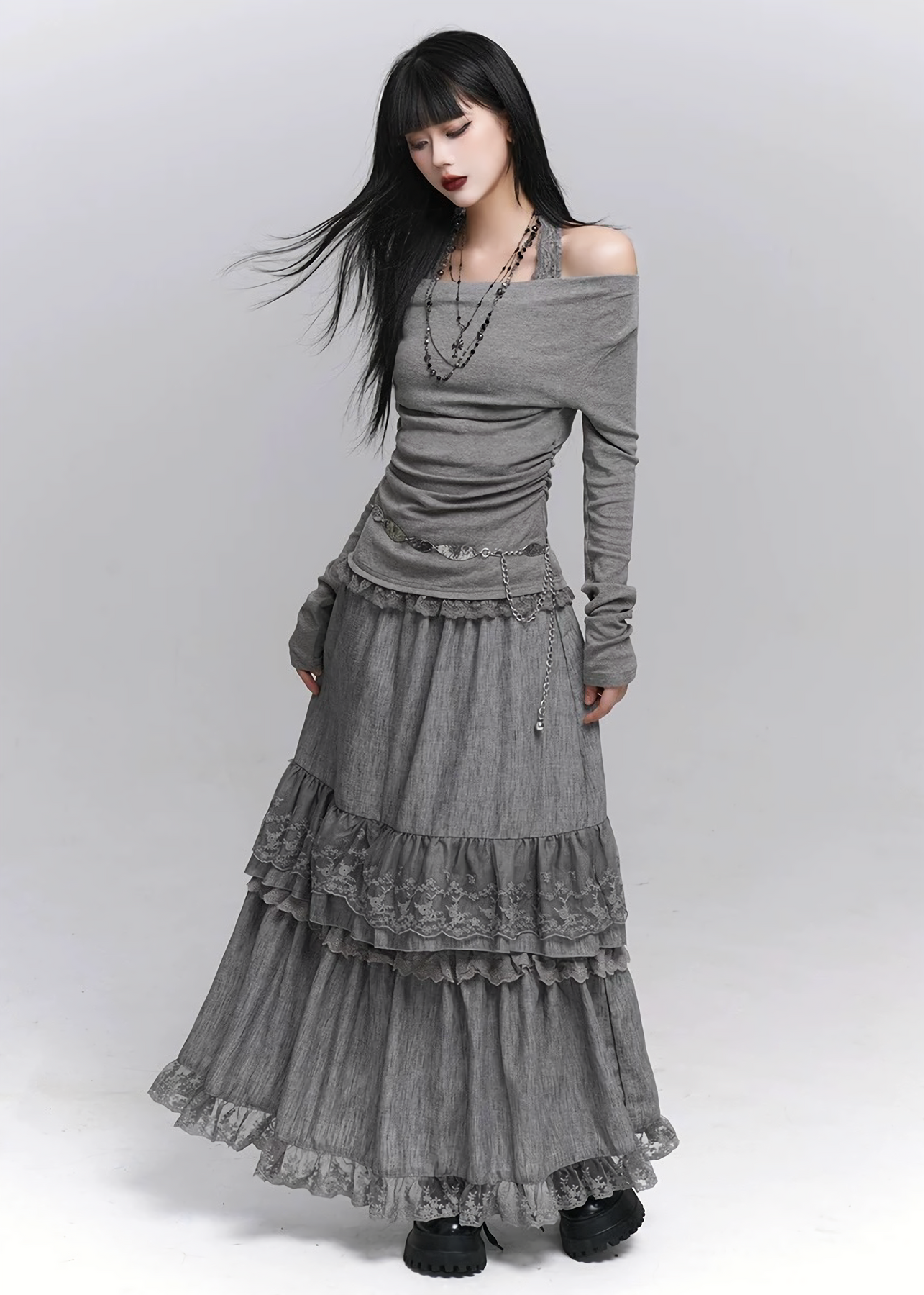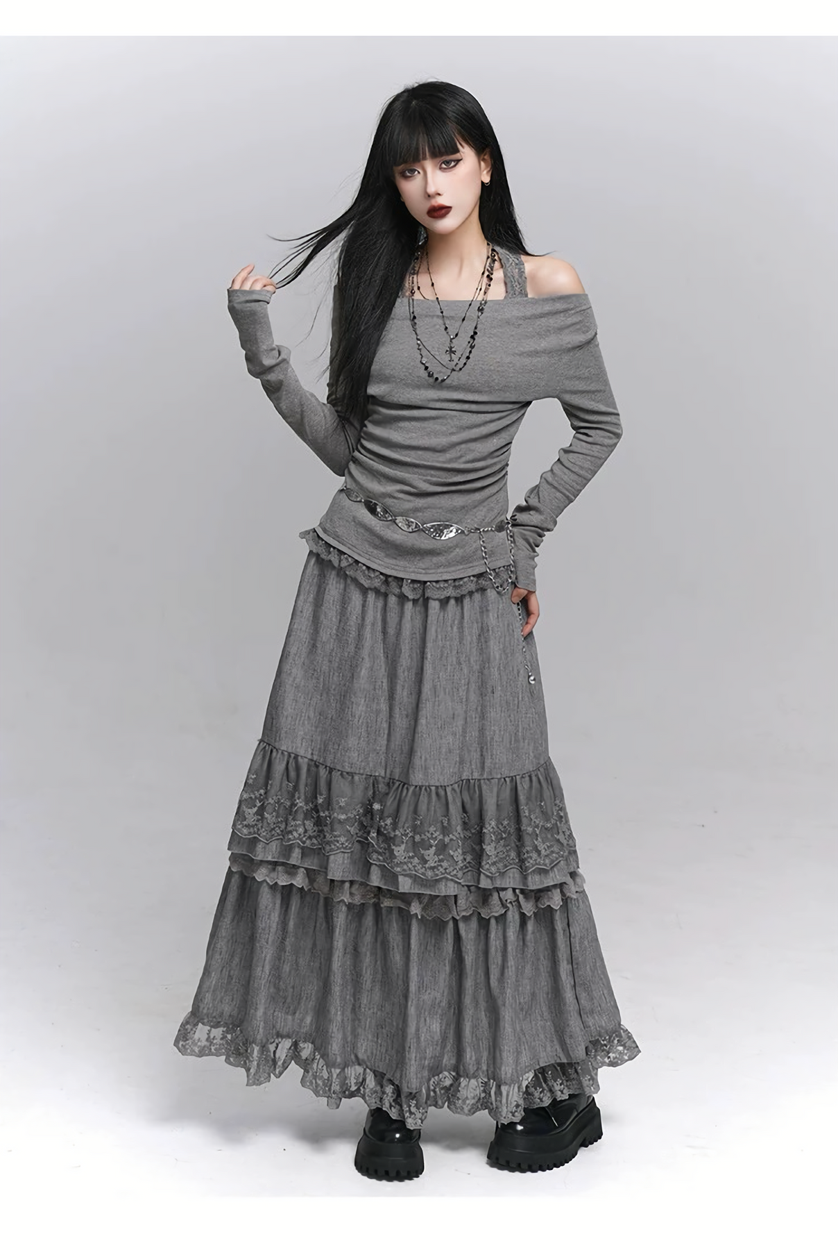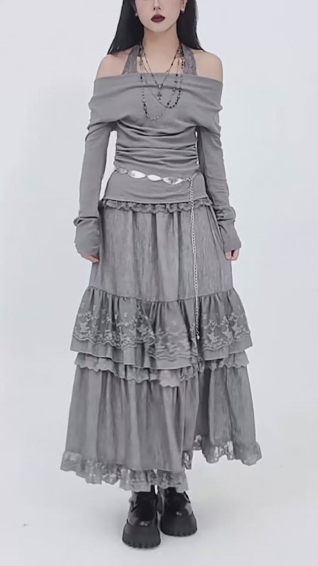 繊細なレースとフリルを重ねた、アンティークドレスのようなロングスカート🩶