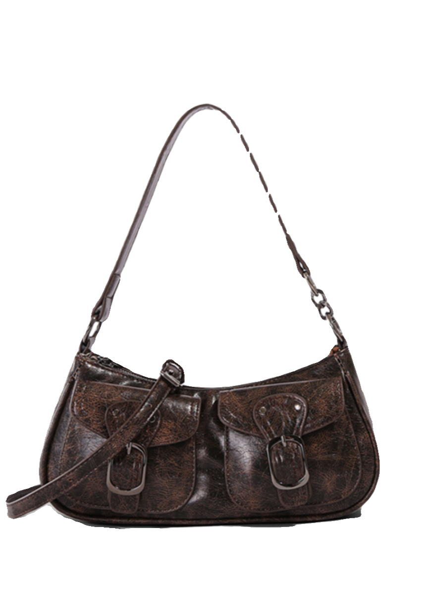 ヴィンテージライクな質感が目を惹く、ダブルバックル付きショルダーバッグ。