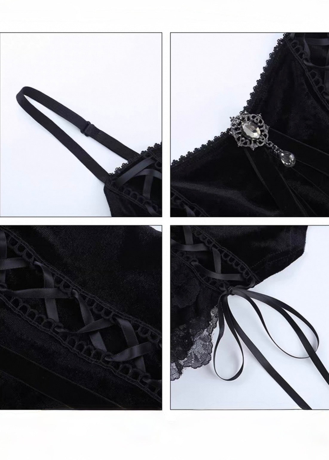 コルセット風のレースアップがウエストラインを美しく魅せるベルベットキャミ。