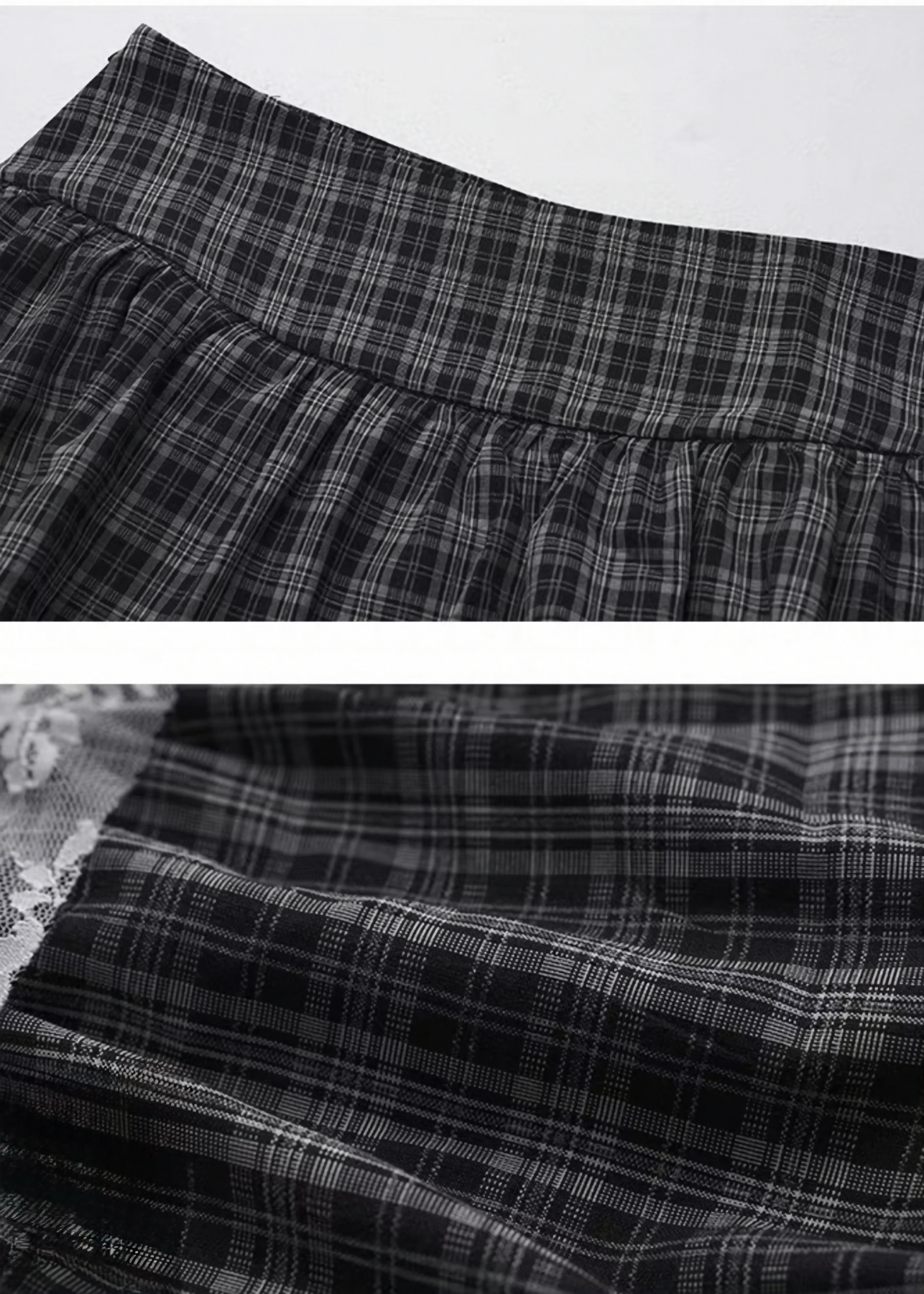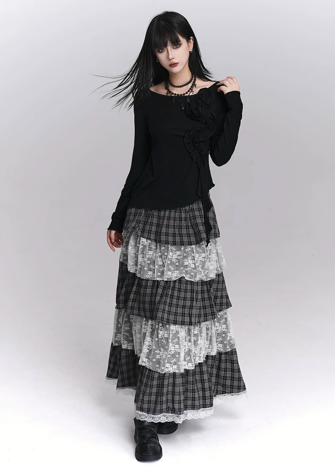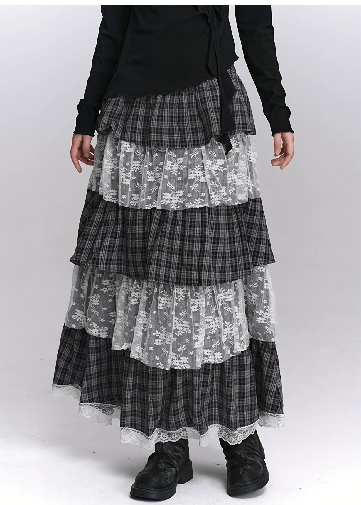 クラシカルなチェック柄と繊細なレースを組み合わせた、華やかさのあるティアードロングスカート。