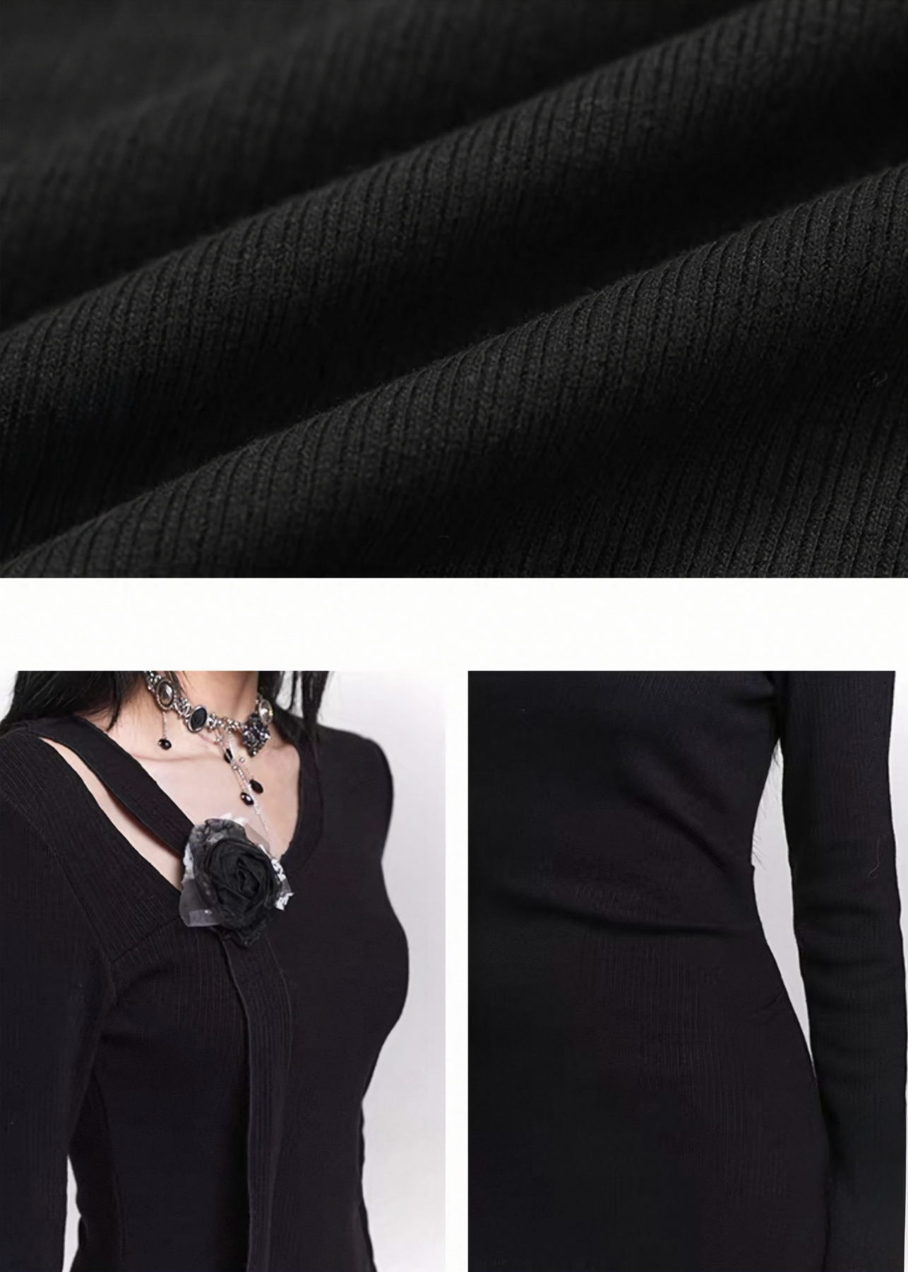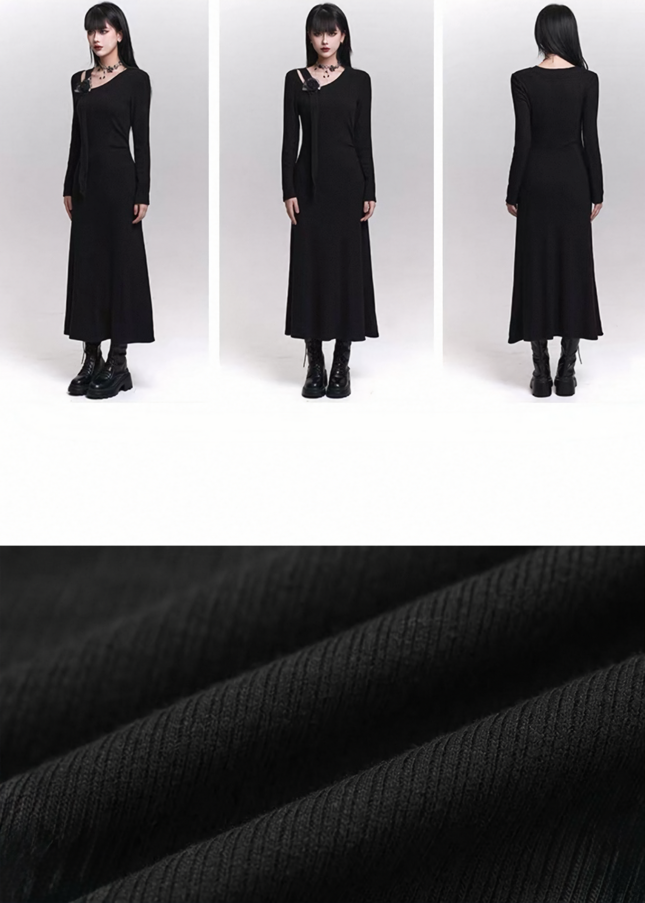 ミニマルなブラックニットに、ストラップ部分の花びらモチーフ(ローズ風ワッペン)が静かに映えるロングワンピース。