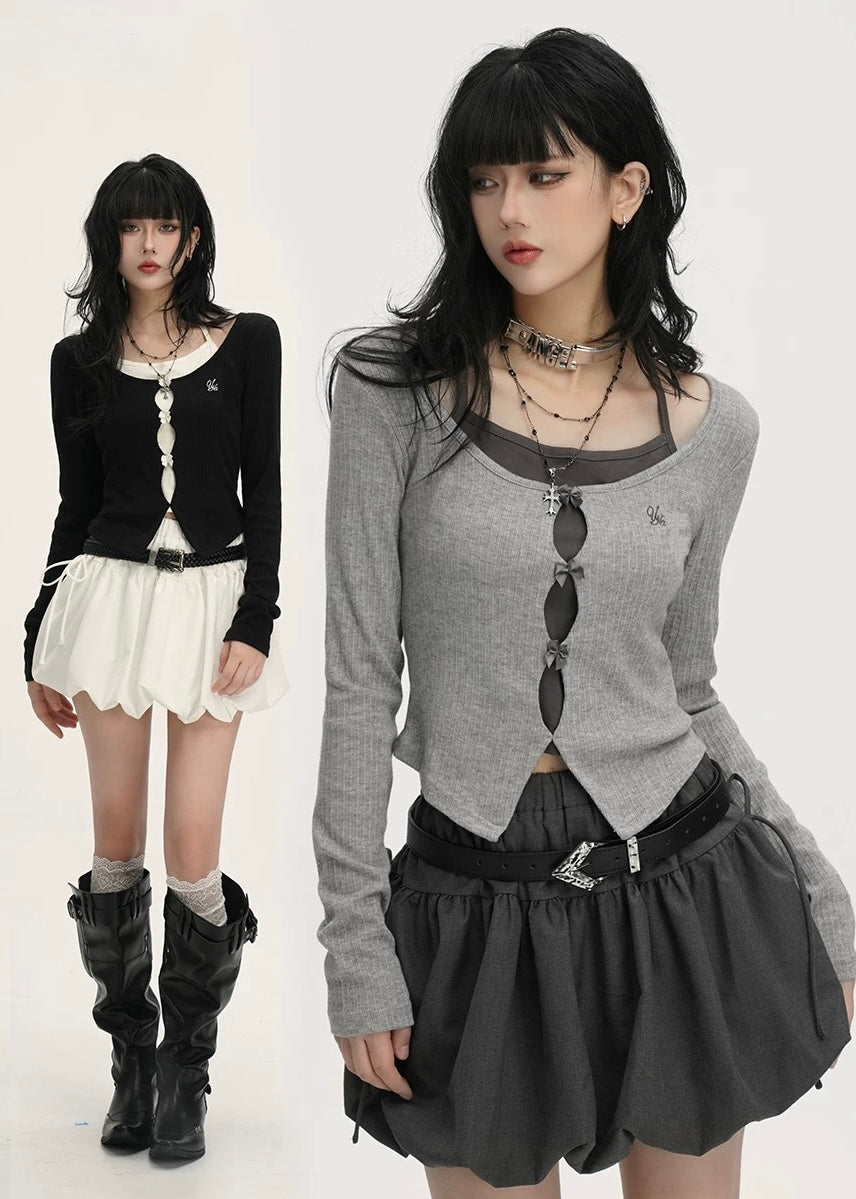 大胆なフロントホックデザインで視線を奪うロングスリーブトップス。