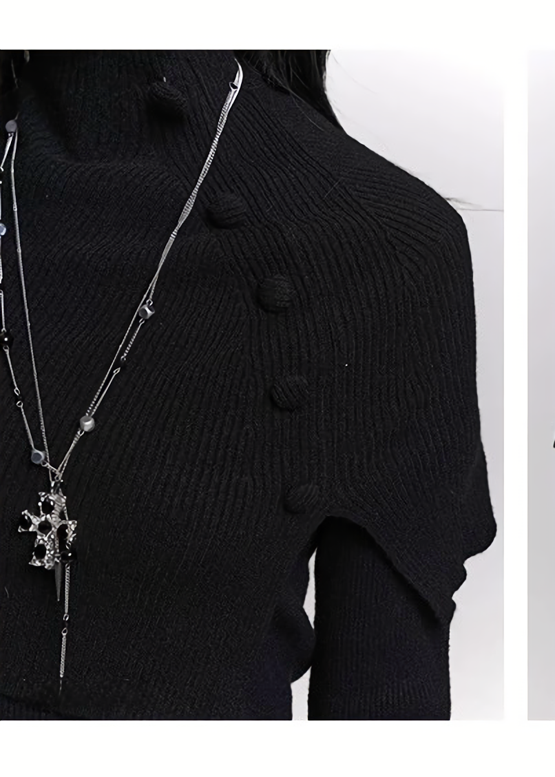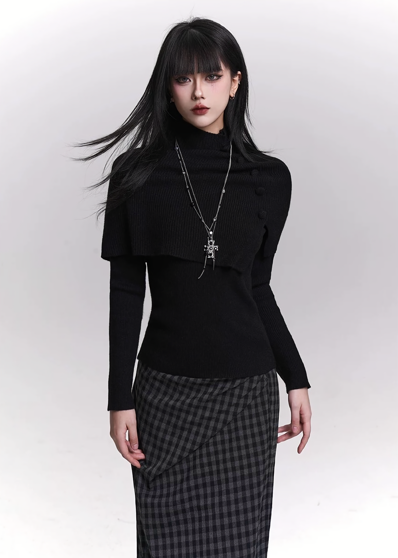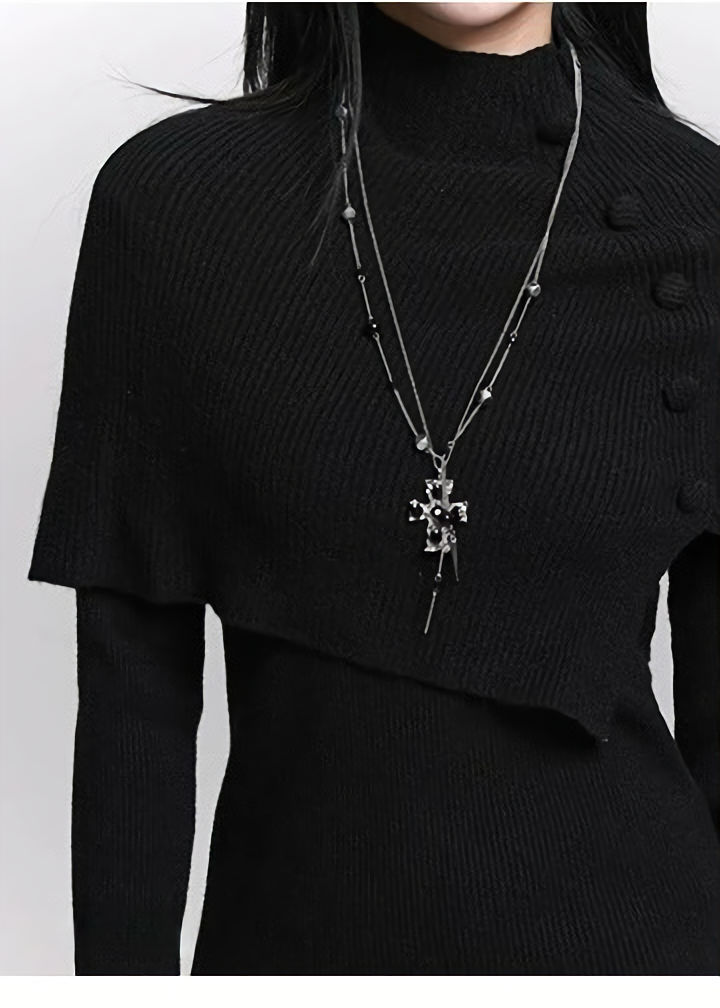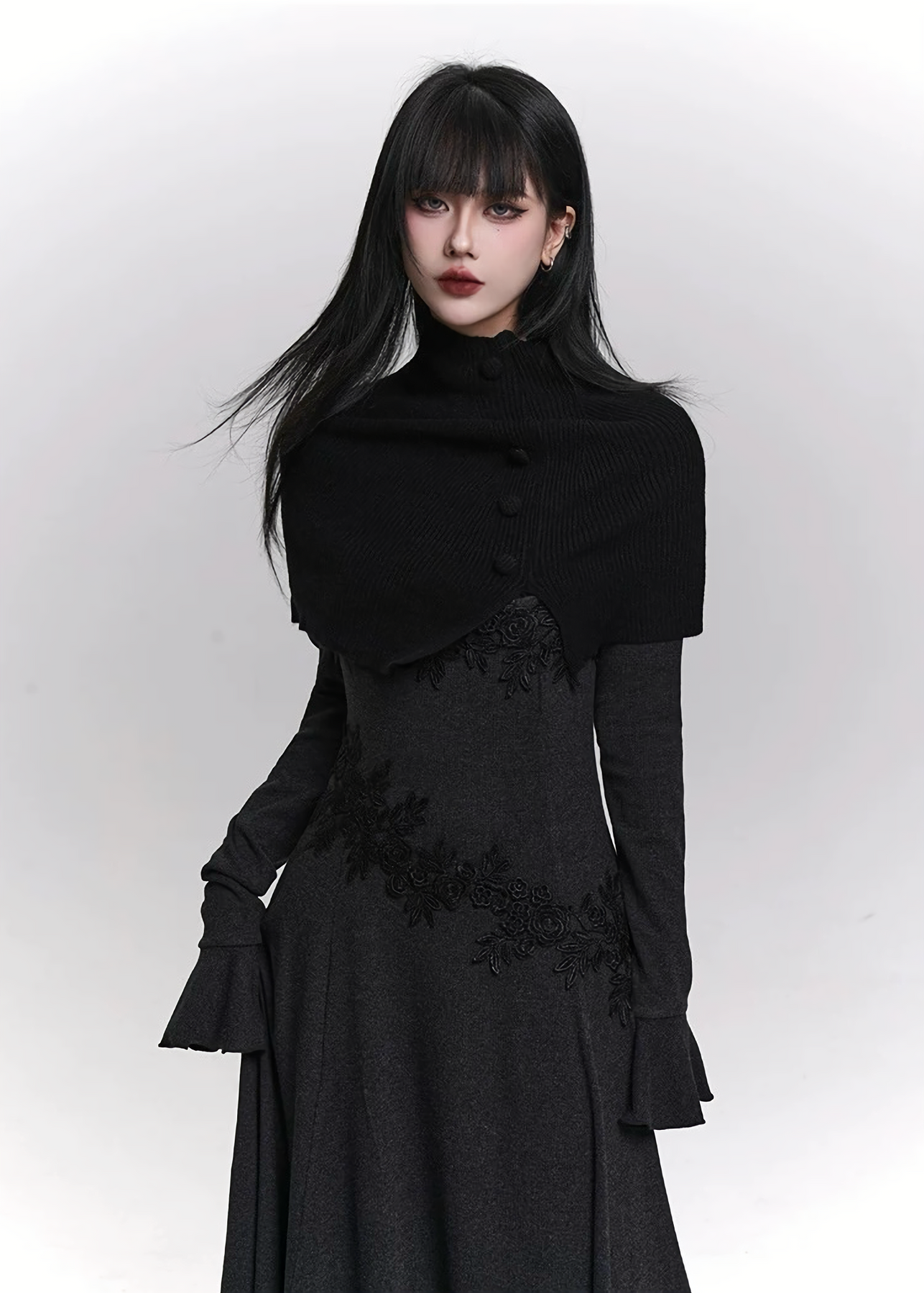 ショート丈のニットケープと、フレアスリーブのロングトップを組み合わせた 2ピースセット。