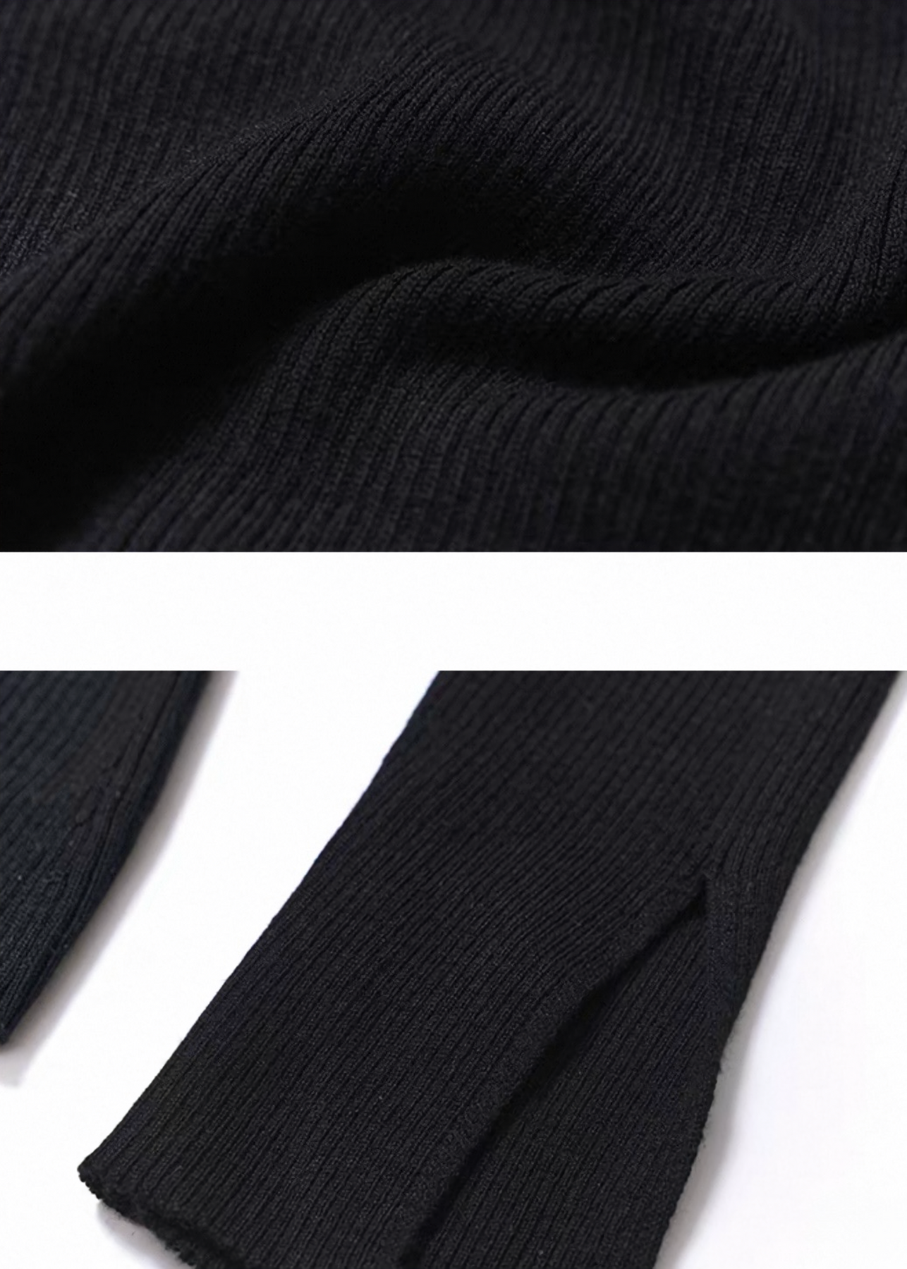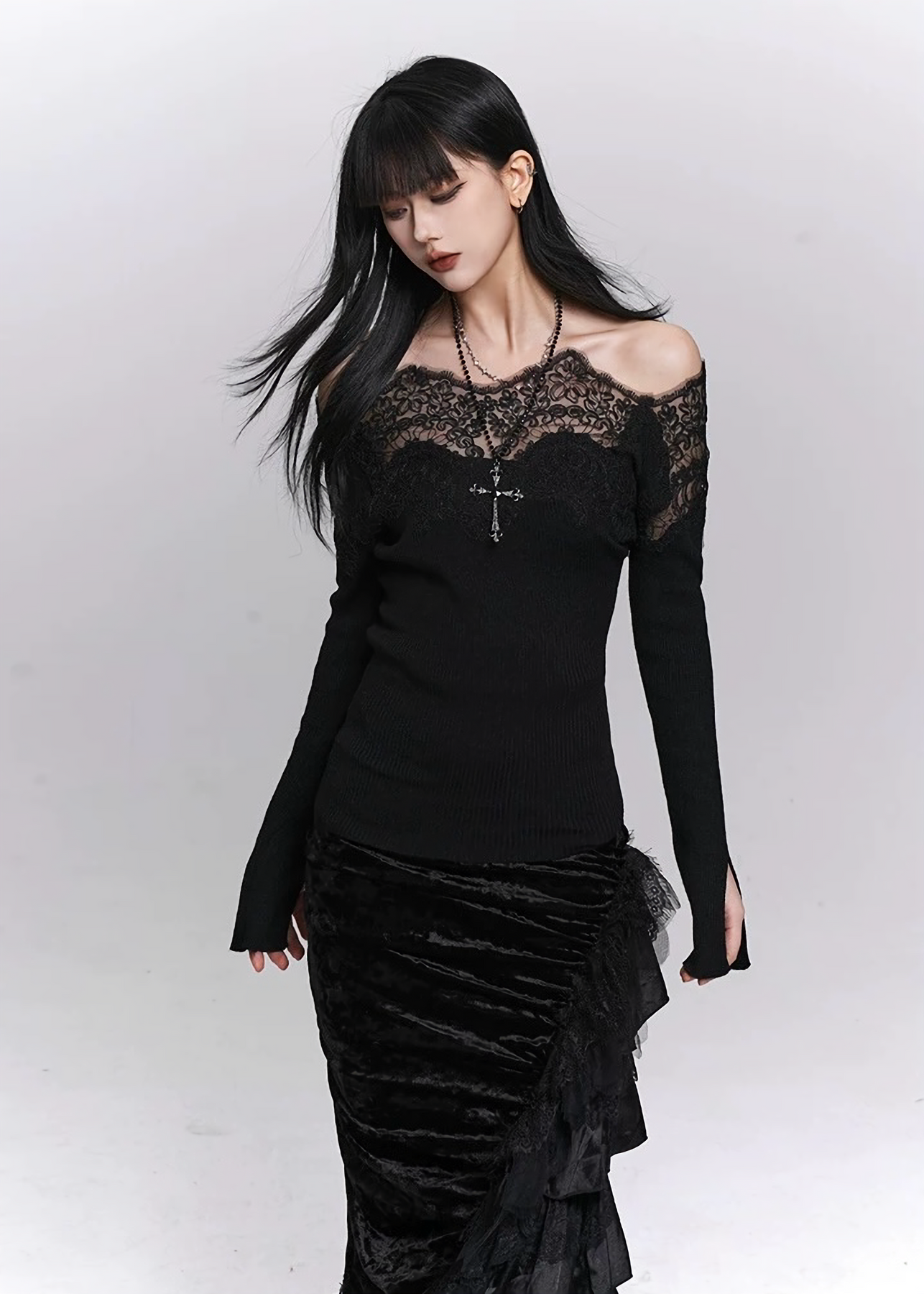 ビスコース・ポリエステル・ナイロンを使用した軽やかなニットは、身体に沿いすぎずに美しいラインを描き、肩まわりの抜け感と長めのスリーブが“静かなダークフェミニン”をつくり出します。
