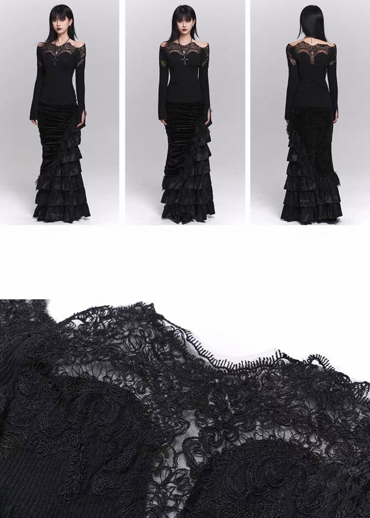 ティアードのフリルが静かな黒の奥行きを引き立て、トップスと合わせるだけで落ち着いたダークフェミニンが完成します。