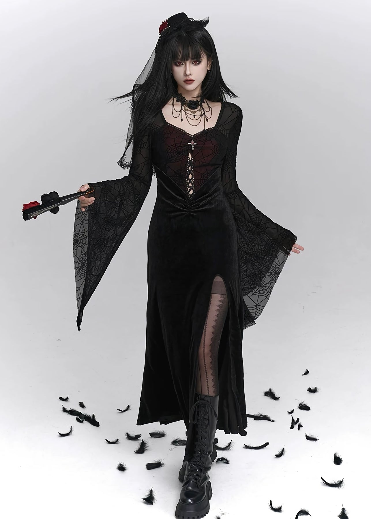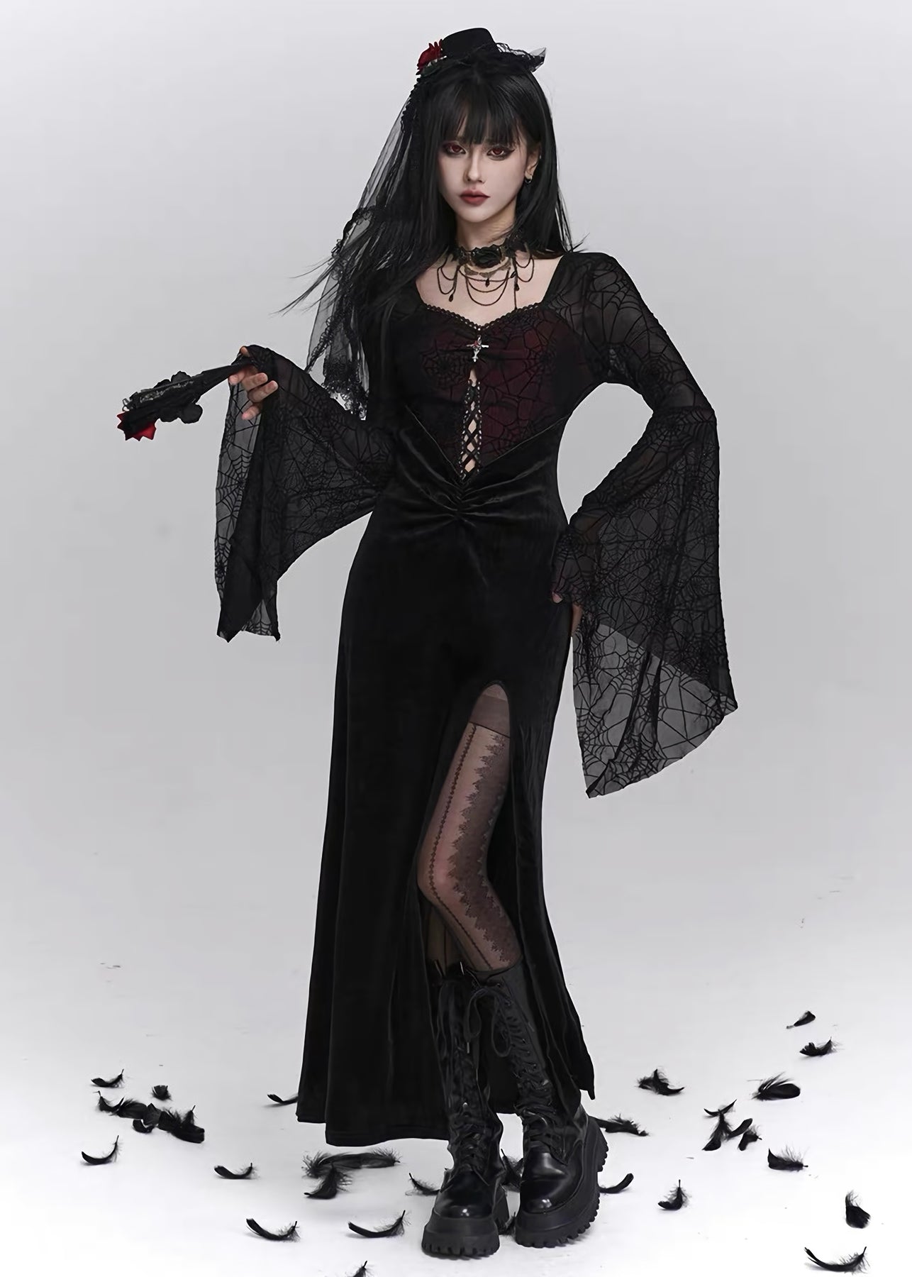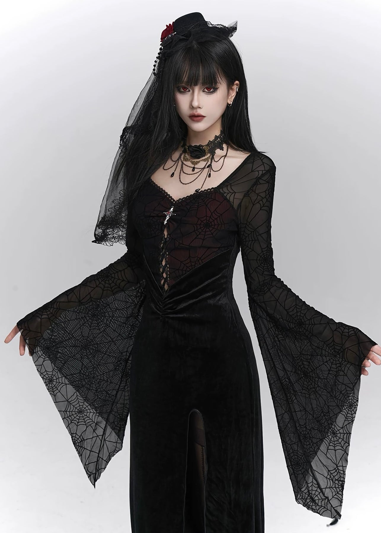 闇に溶け込むような深いブラックベルベットに、蜘蛛の巣モチーフのレーススリーブが広がるゴシックロングドレス。
