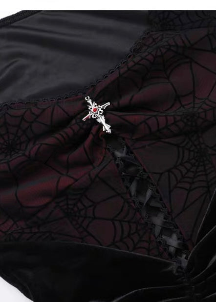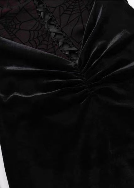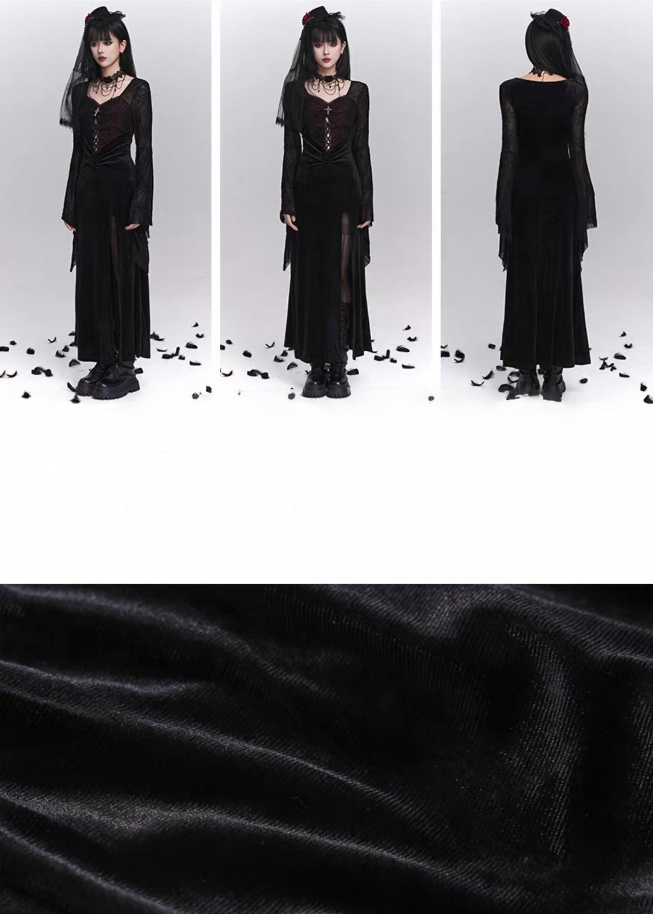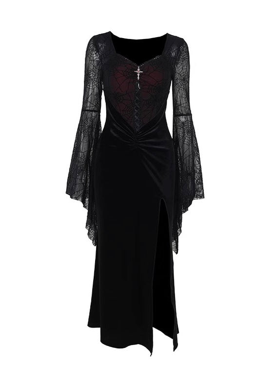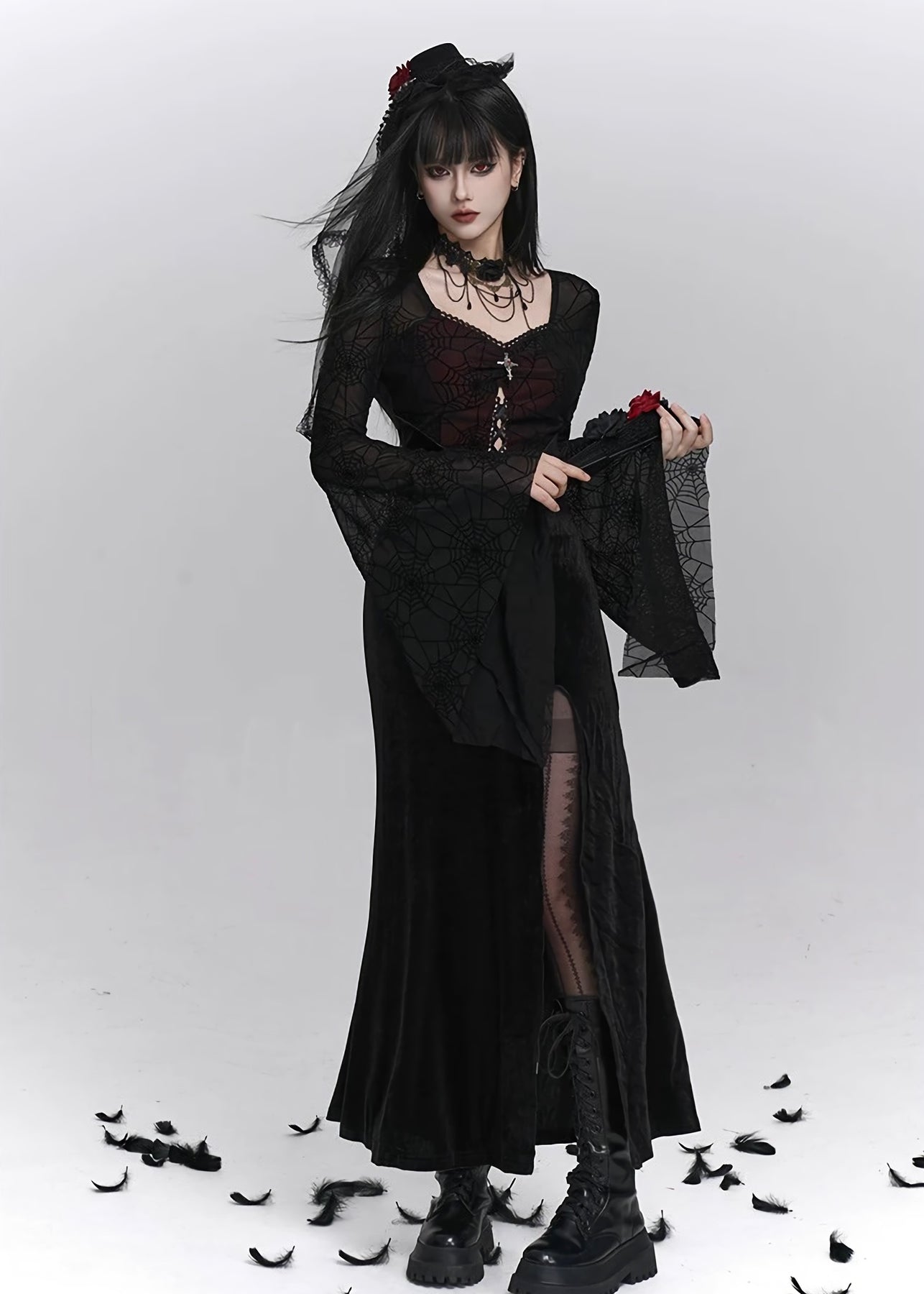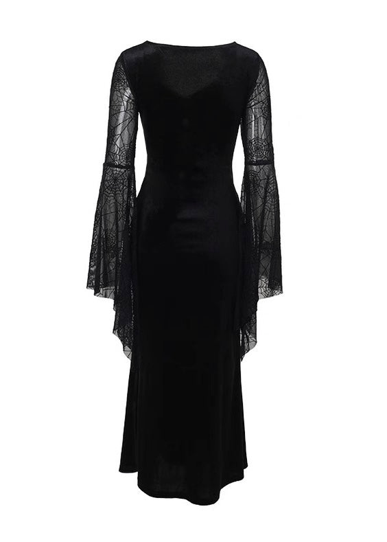 闇に溶け込むような深いブラックベルベットに、蜘蛛の巣モチーフのレーススリーブが広がるゴシックロングドレス。
