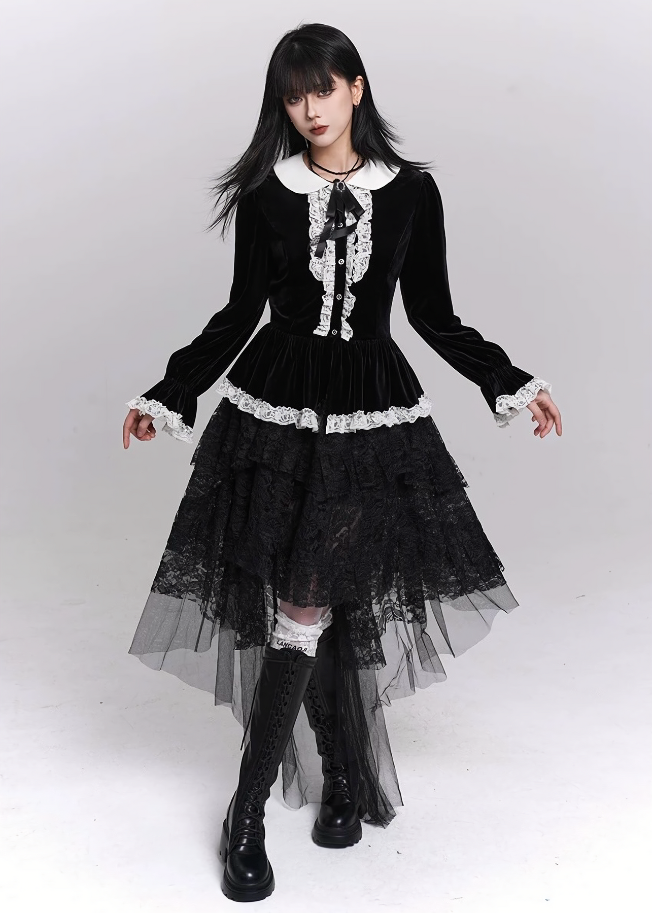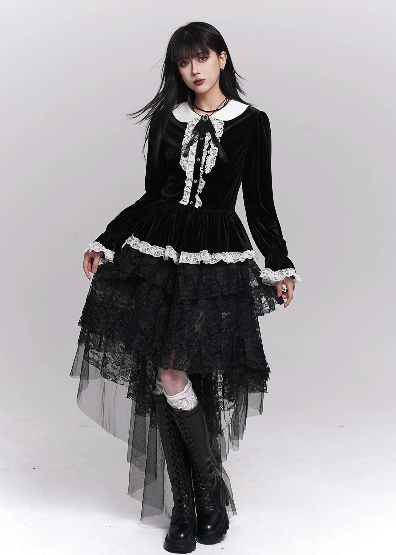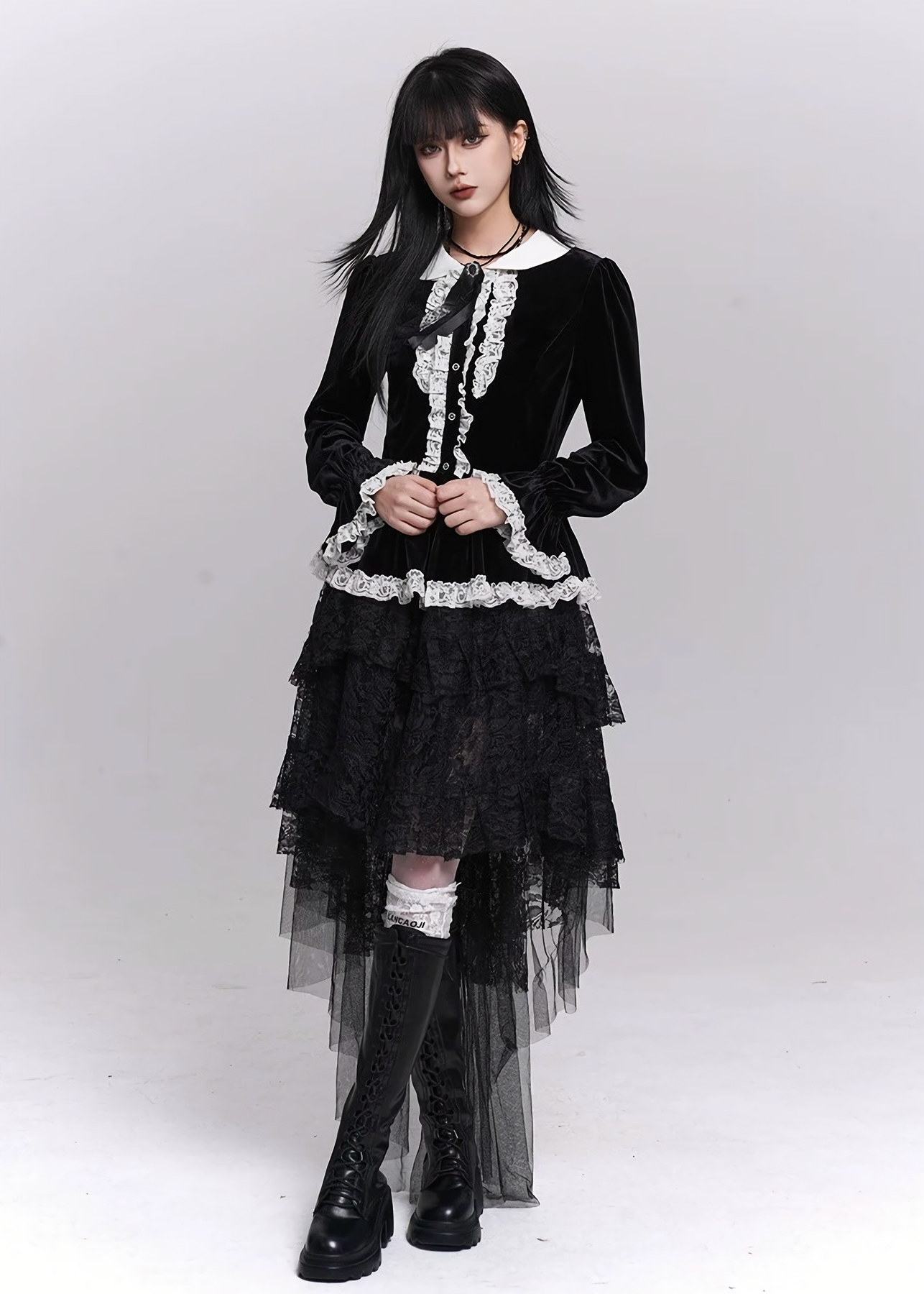 白いラウンドカラーとフロントにあしらわれた繊細なレースフリルが、黒の中に静かなコントラストを生み、甘さを抑えたゴシッククラシックな印象に。