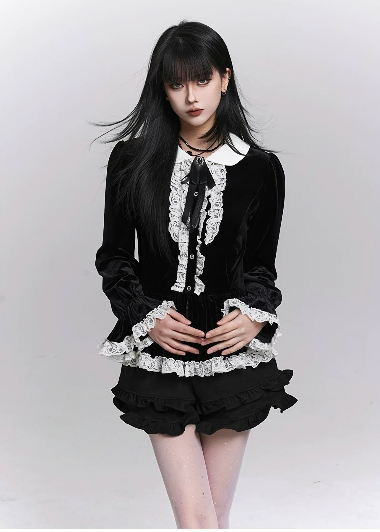 深いブラックのベルベットが、静かな艶をまといながら佇むクラシカルブラウス。