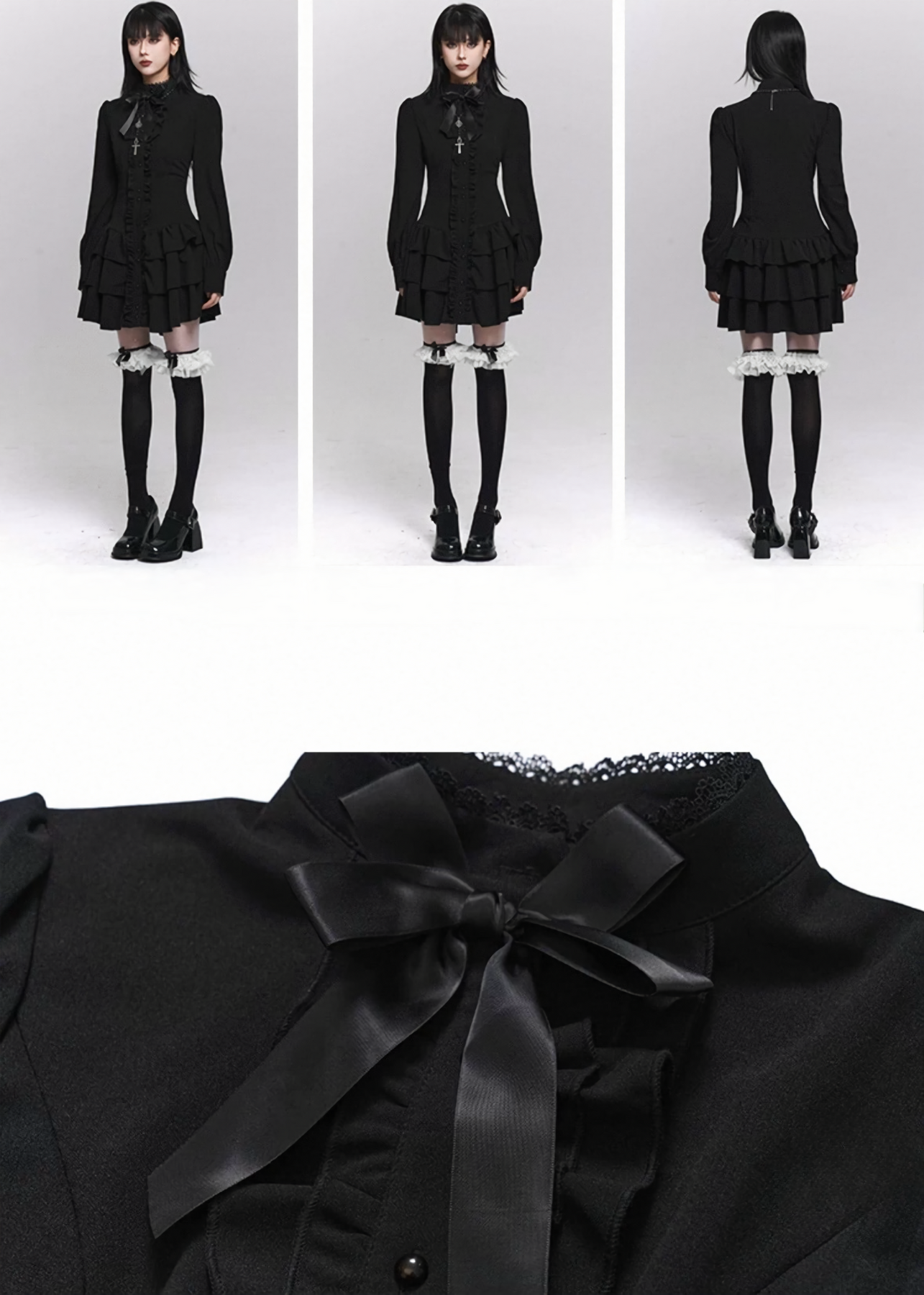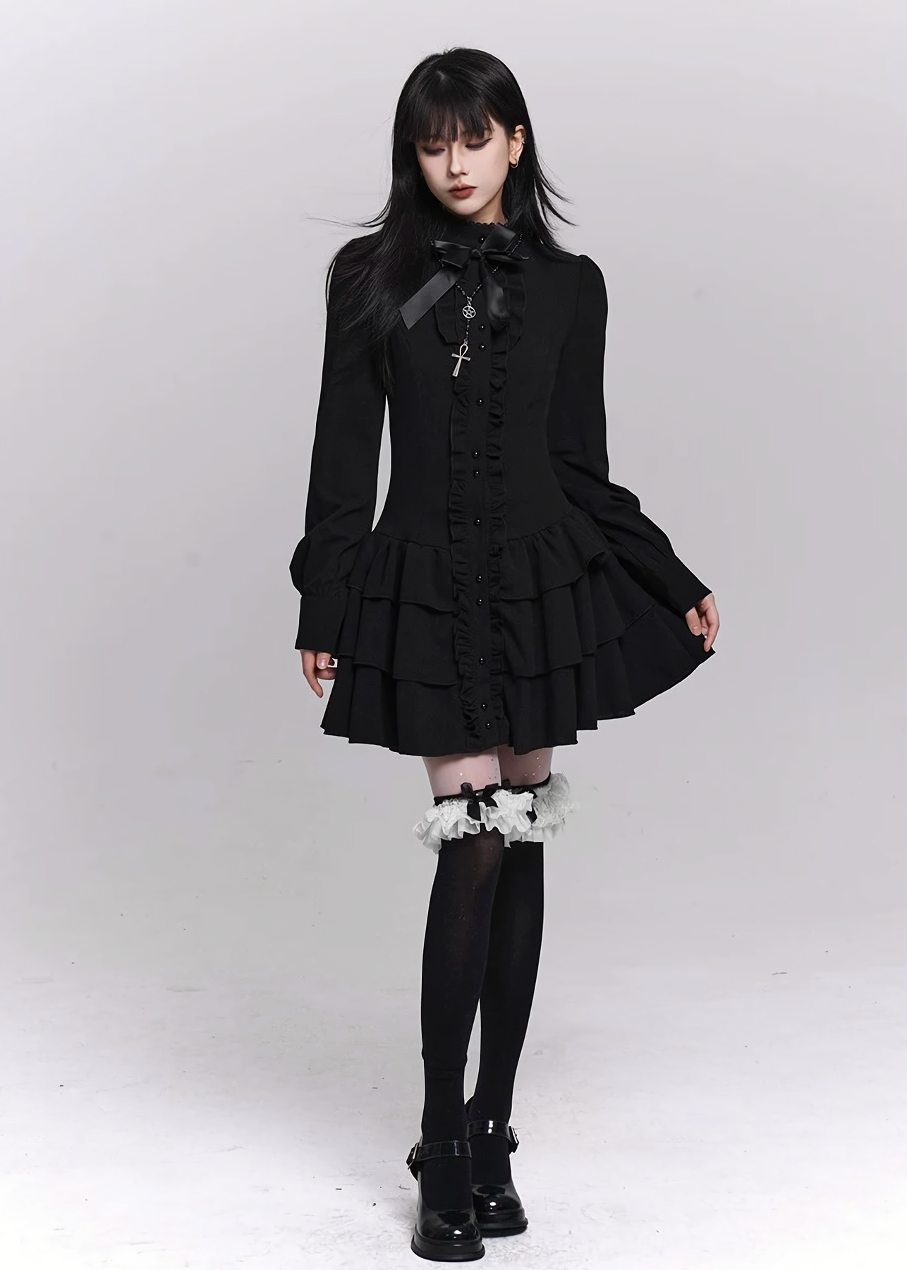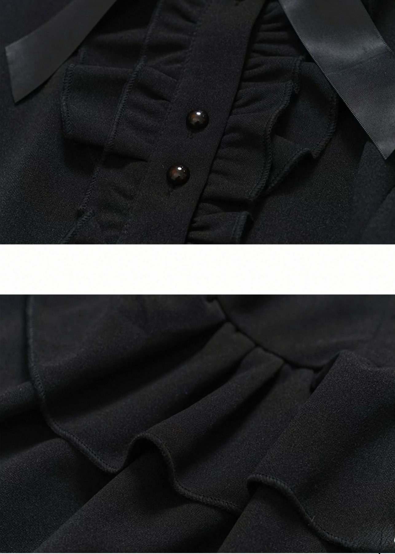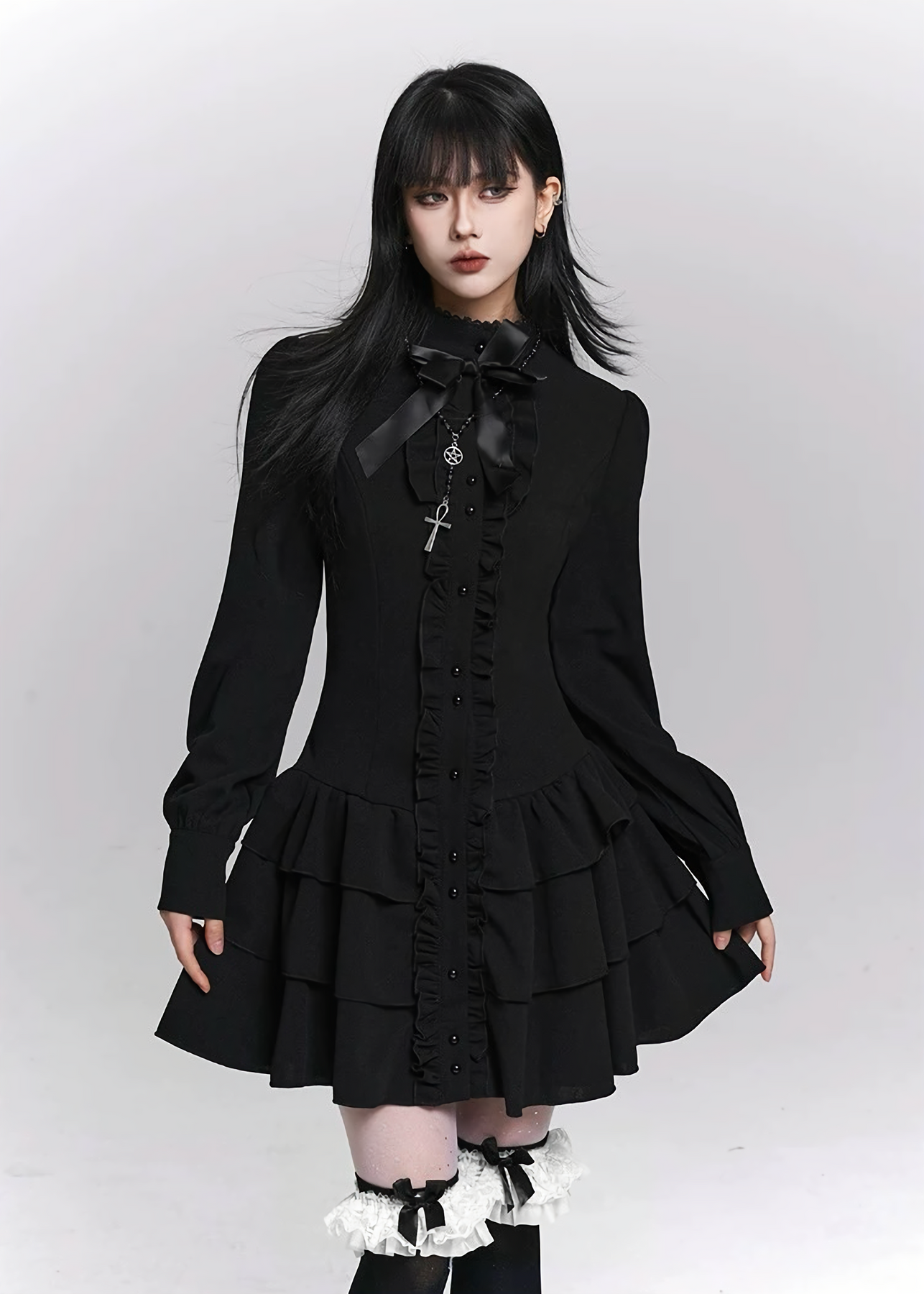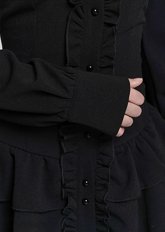 縦に連なるフリルディテールが上半身をすっきりと引き締め、スタンドカラーとリボンモチーフが控えめな装飾として上品な陰影を添えます。甘さを抑えたデザインながら、どこか儚さを残したダークフェミニンな表情が印象的です。