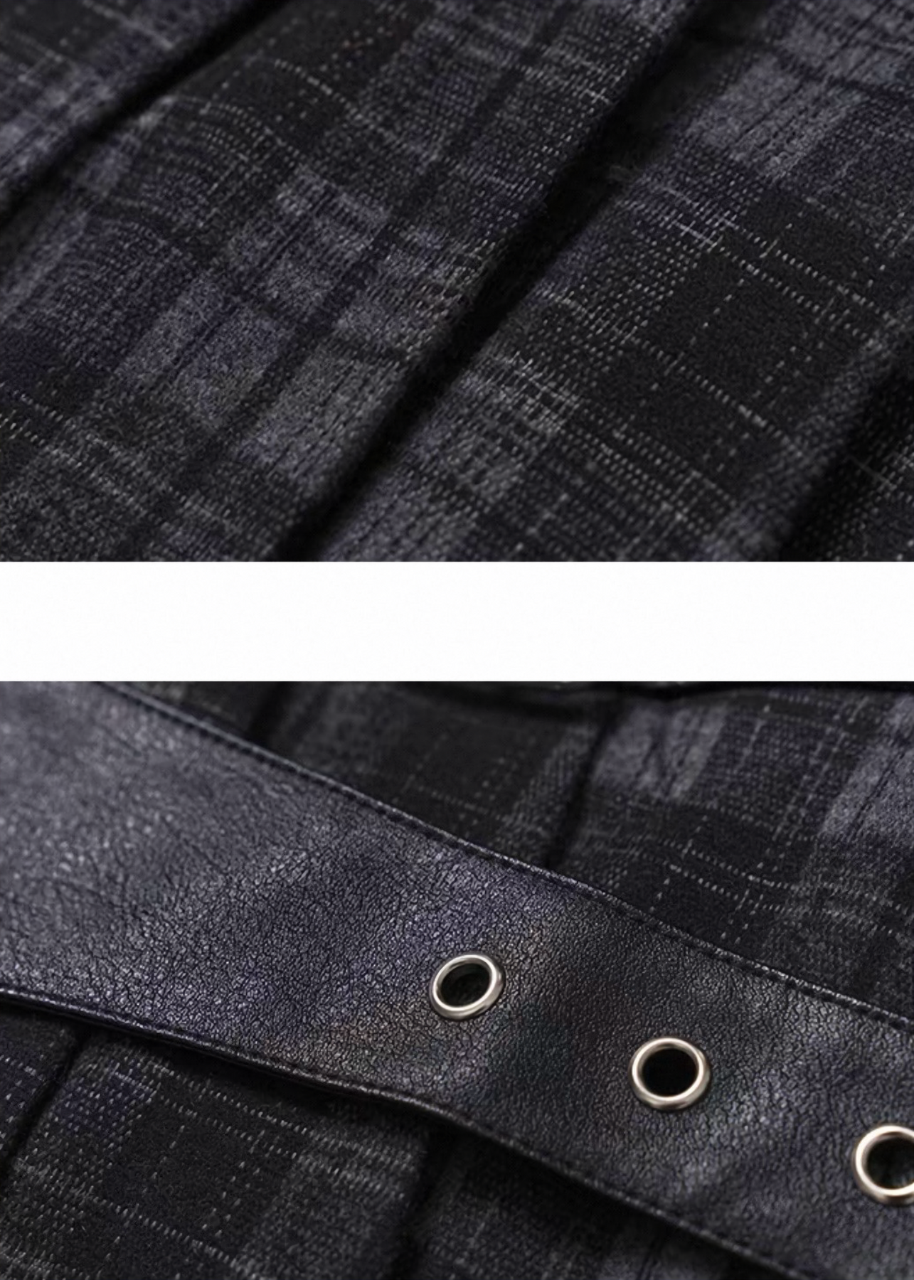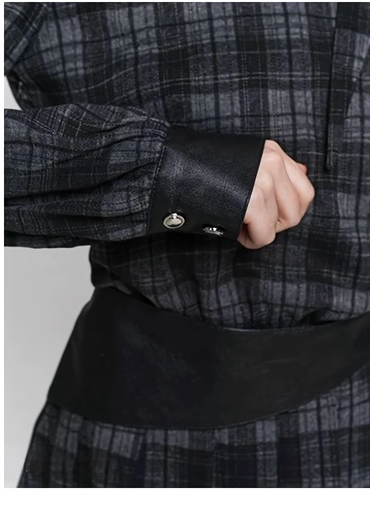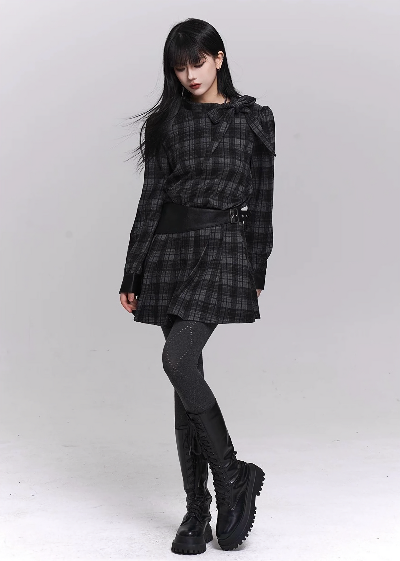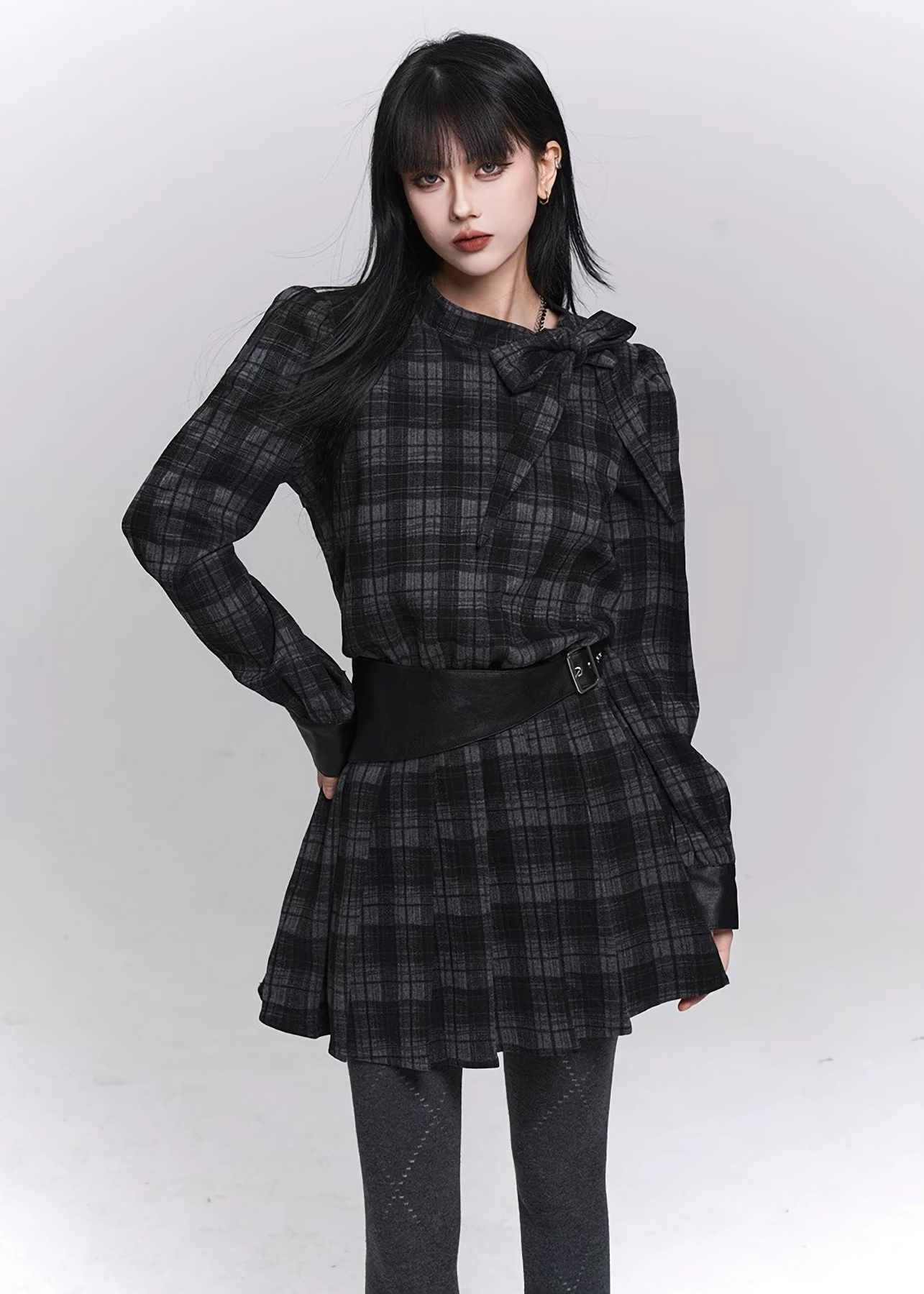 固定ウエストベルトがシルエットを引き締め、シンプルなチェック柄にメリハリを与えています。
