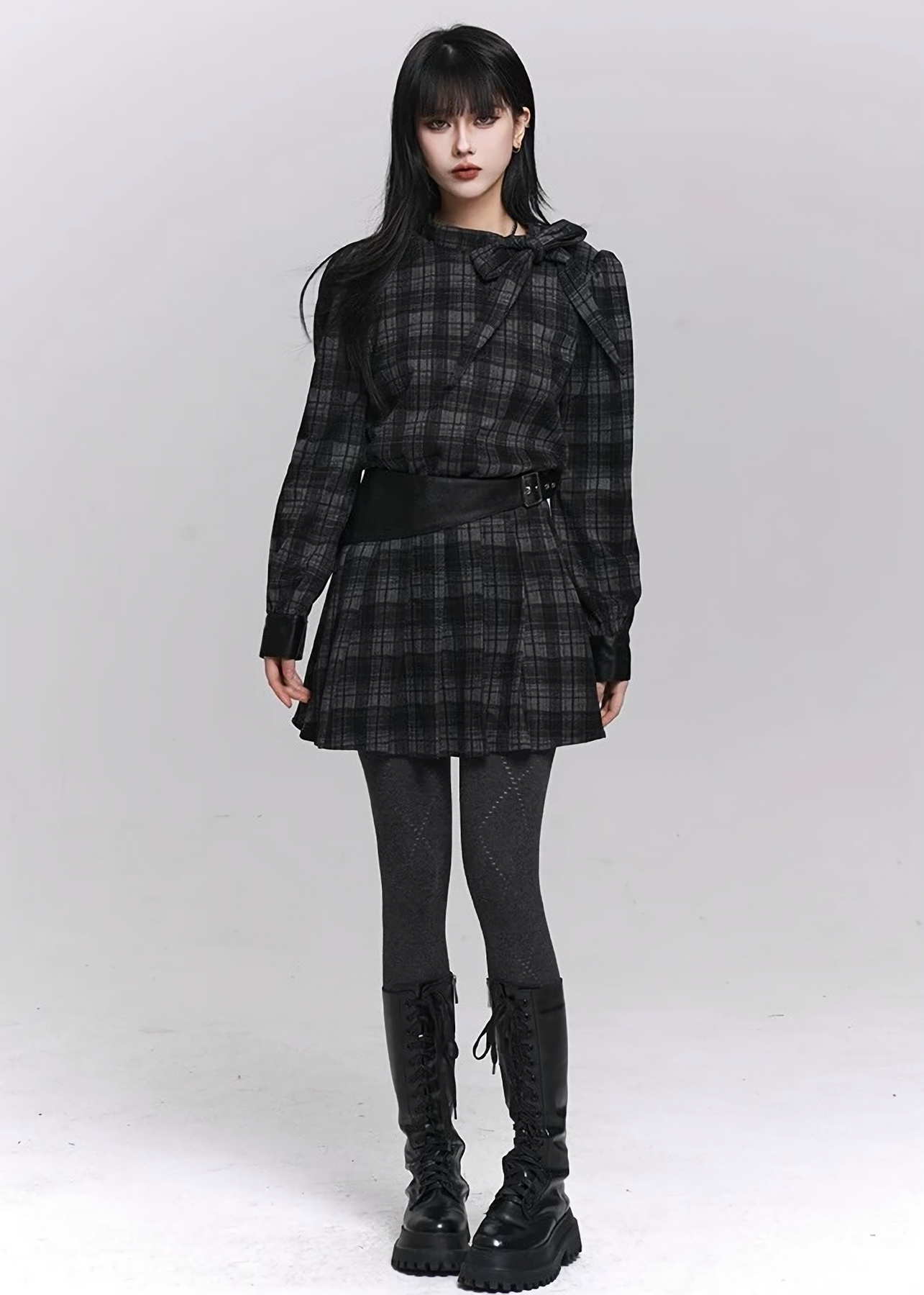 GHOSTLY CHECK RIBBON MINI DRESS / LG1490