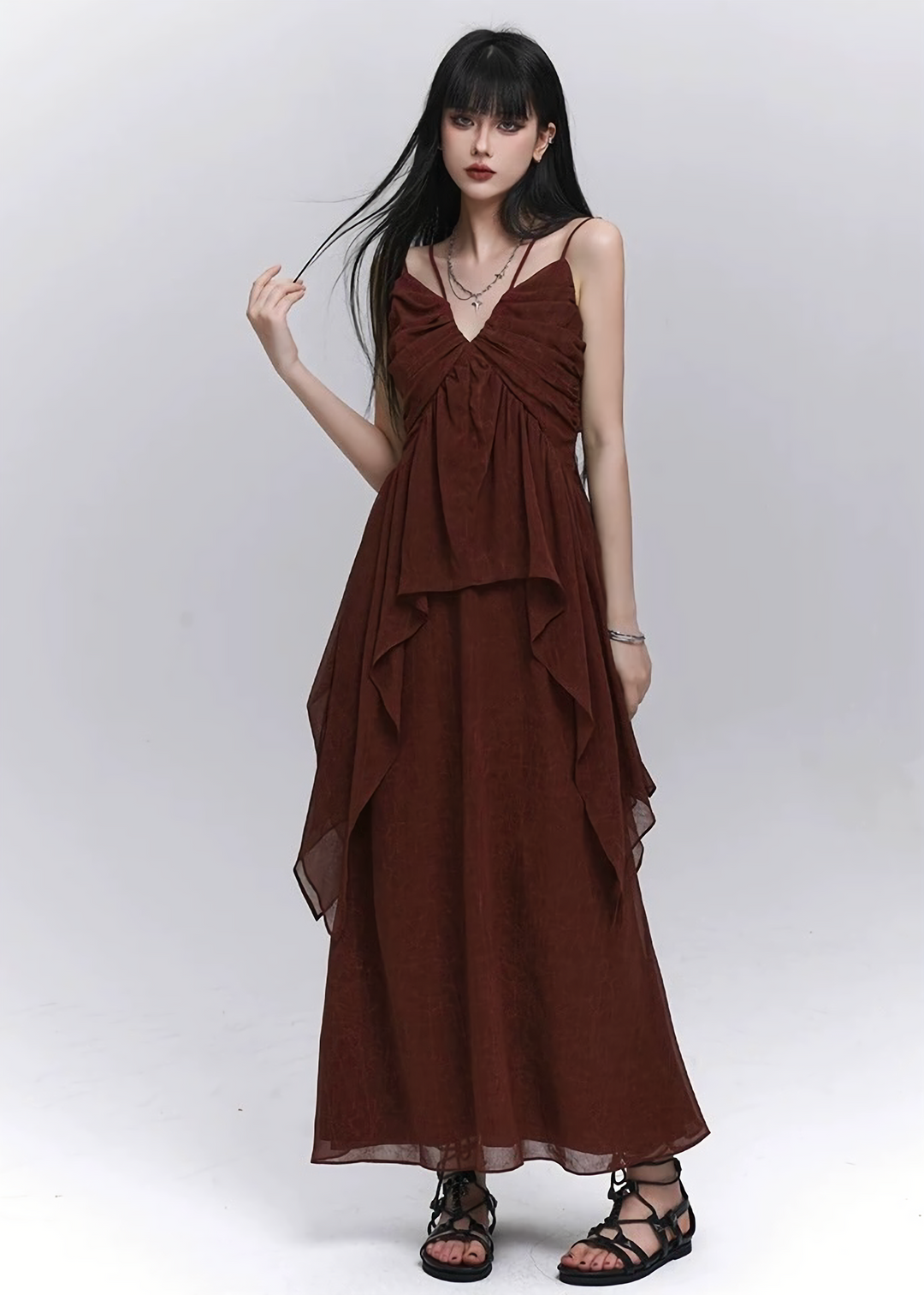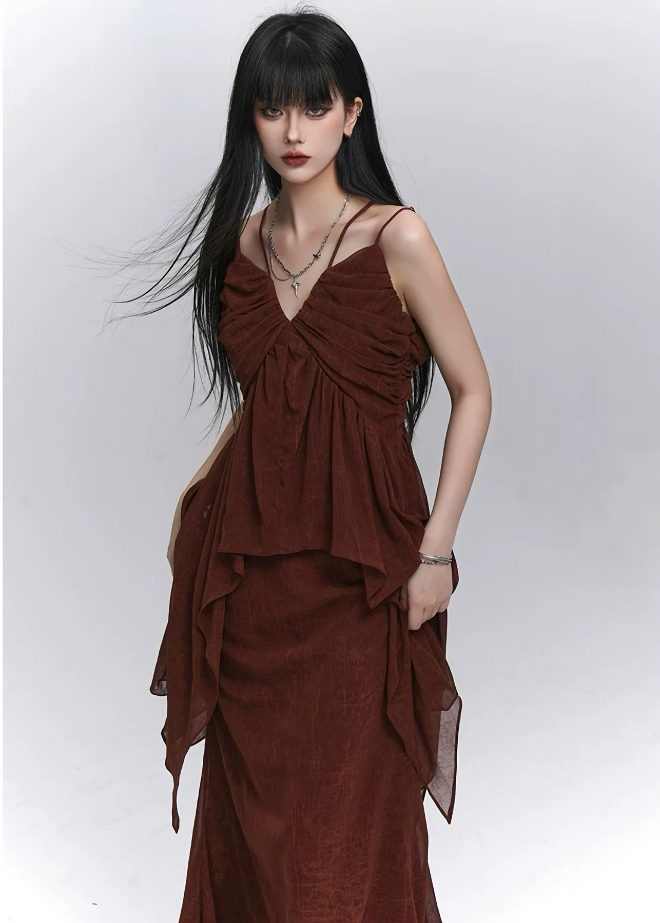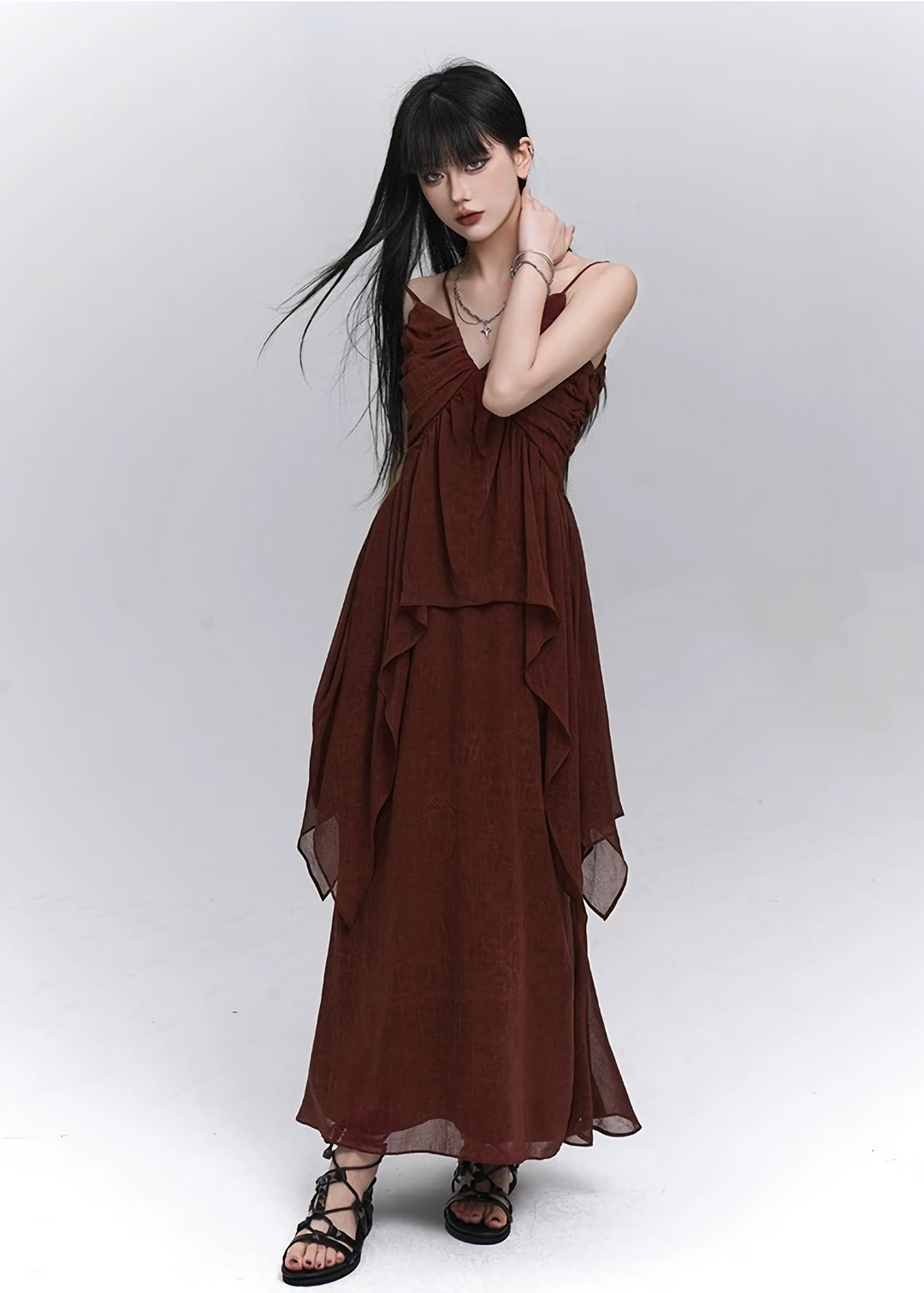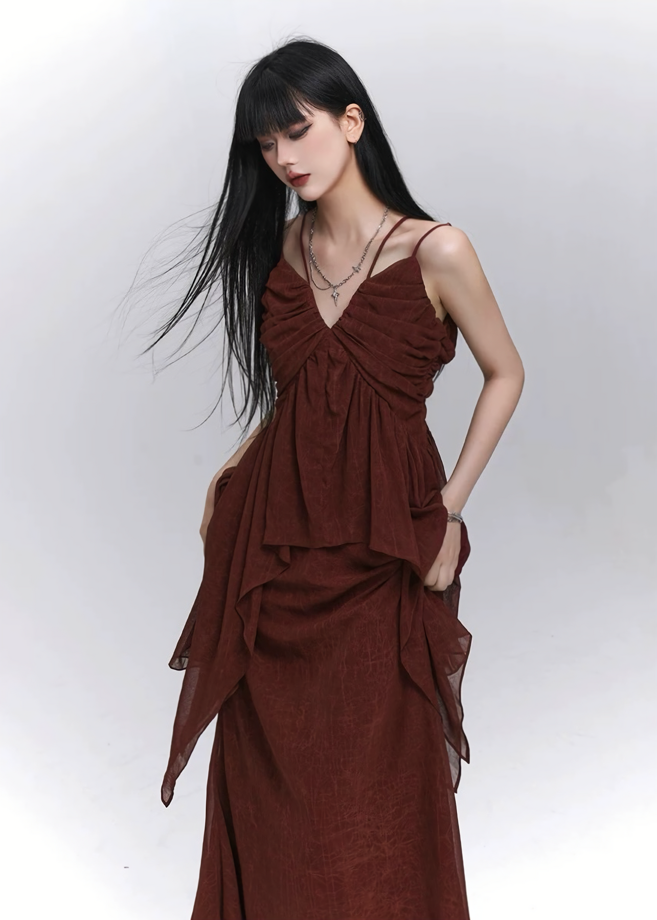 부드럽게 겹치는 드레이프와 깊이가 있는 레드 브라운 칼라가 눈을 끄는,