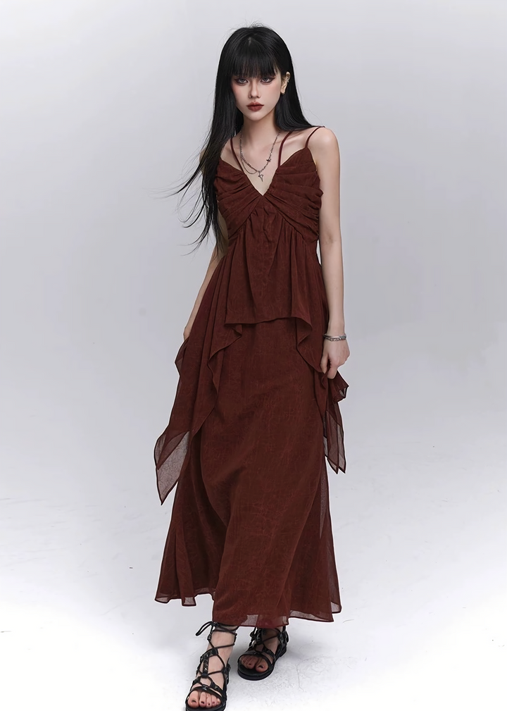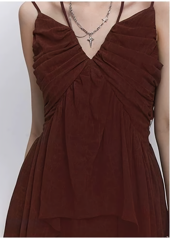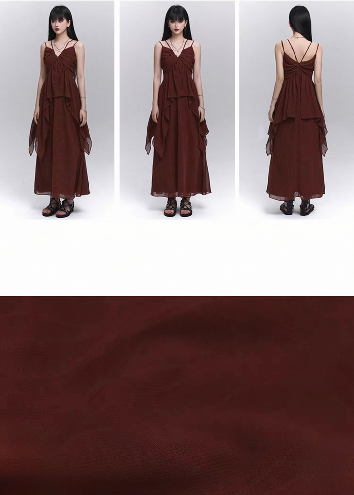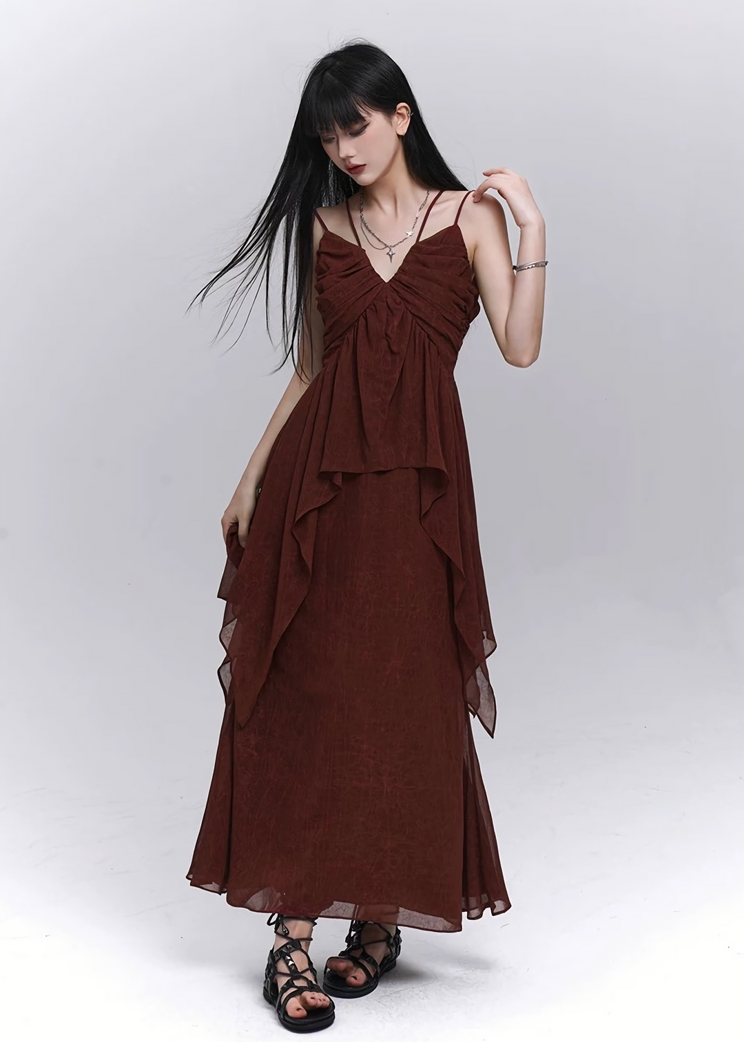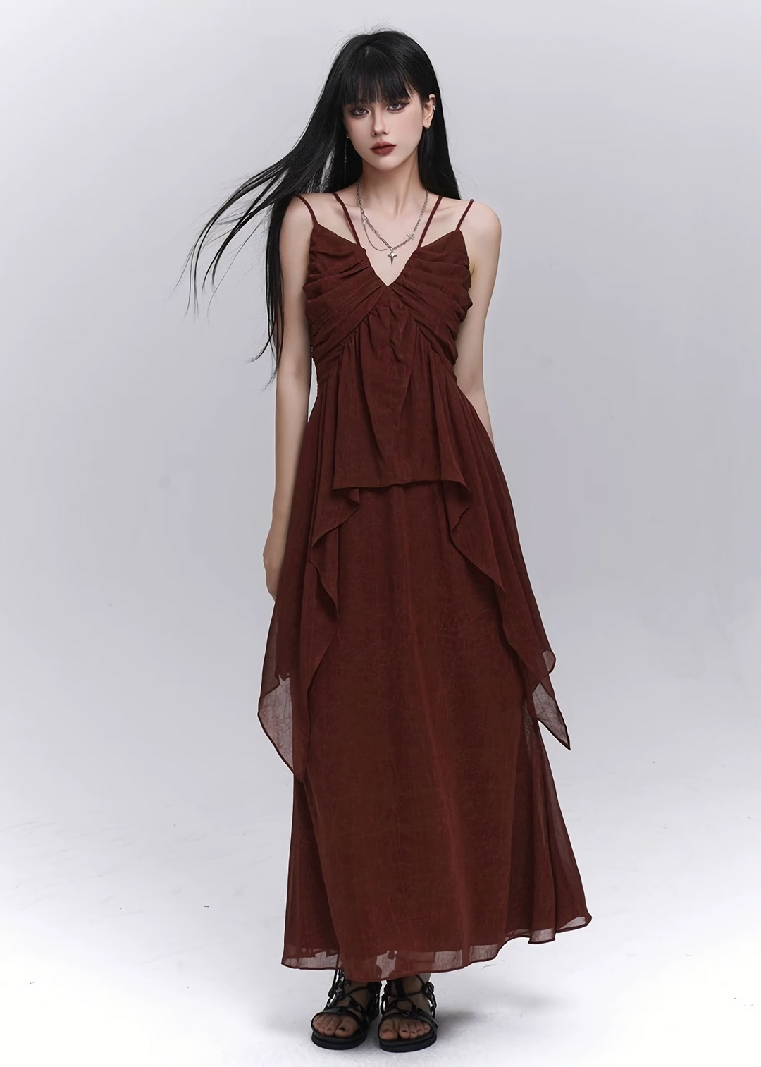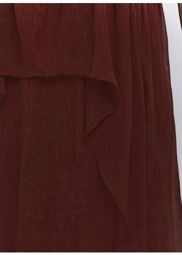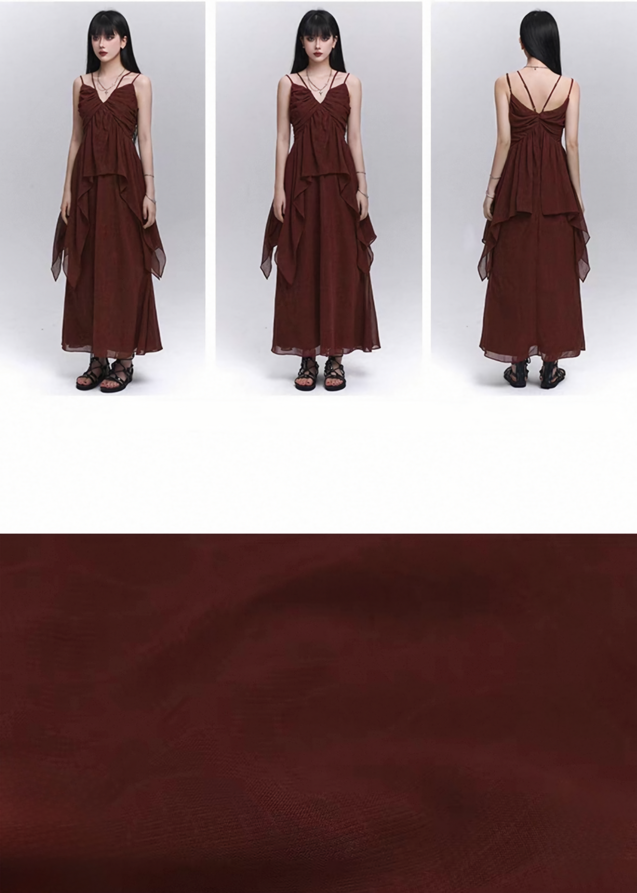 부드럽게 겹치는 드레이프와 깊이가 있는 레드 브라운 칼라가 눈을 끄는,