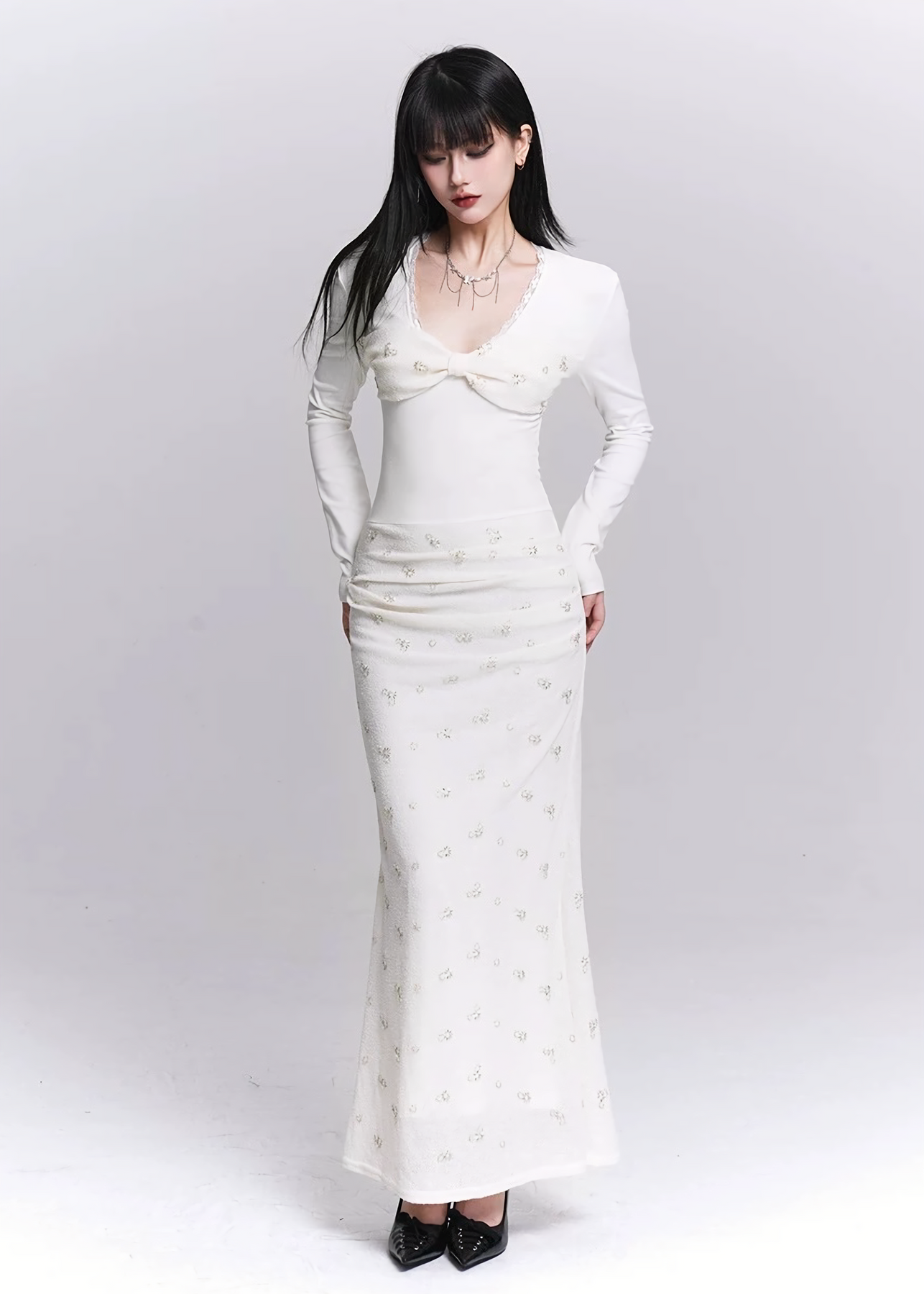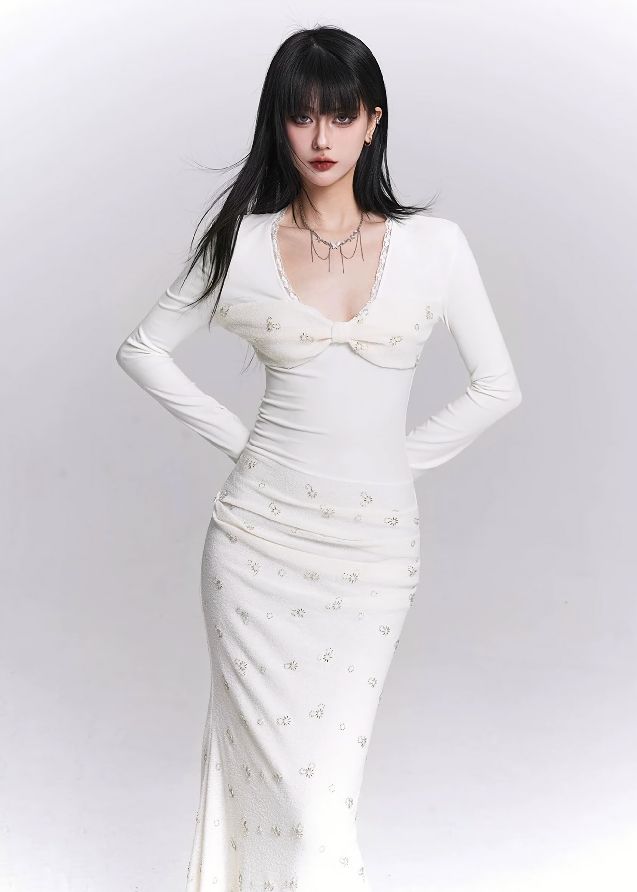 白の静けさに、繊細な装飾を散りばめたスリムフィットドレス。