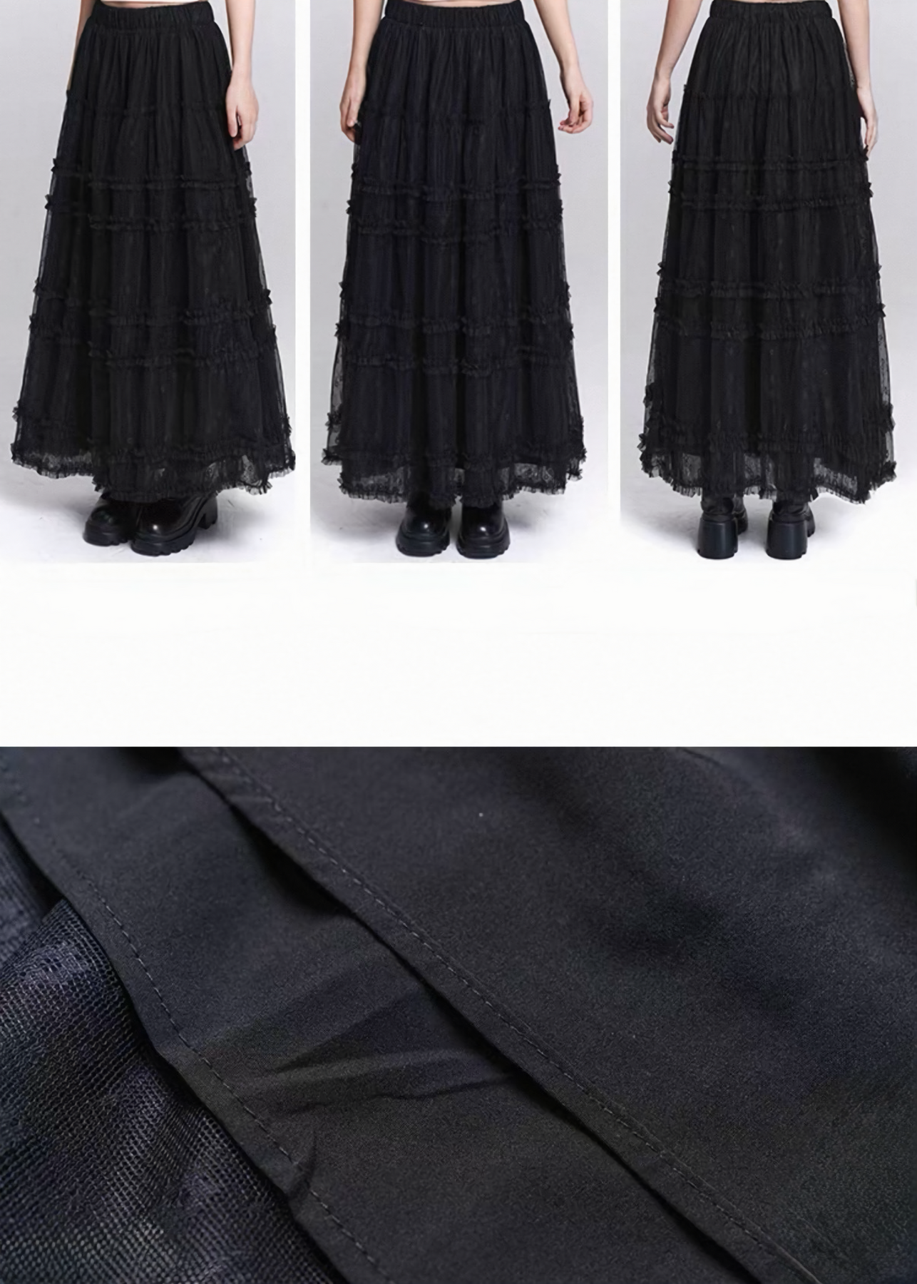 繊細な小花柄メッシュに、段ごとのフリルを重ねたロングスカート。